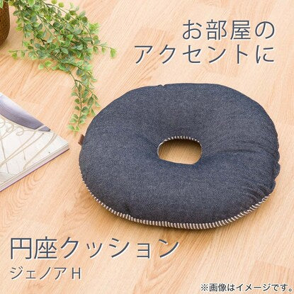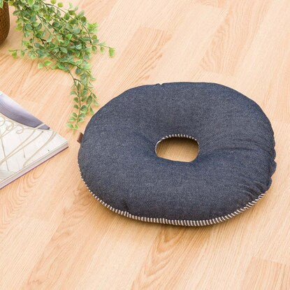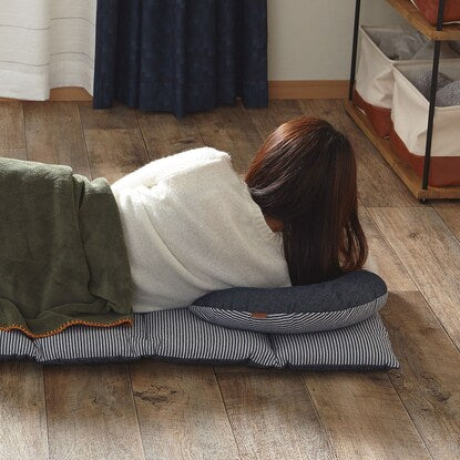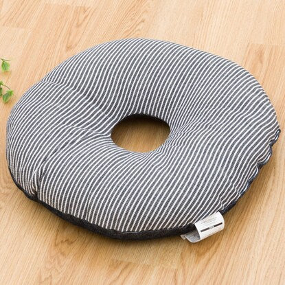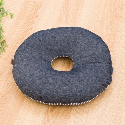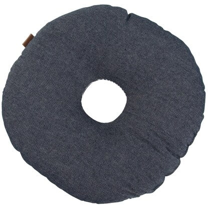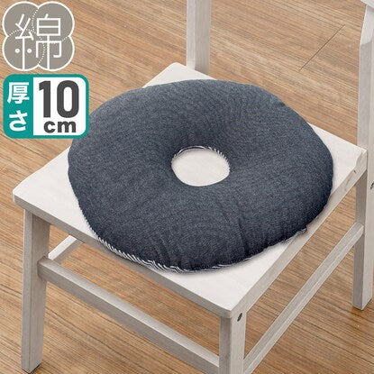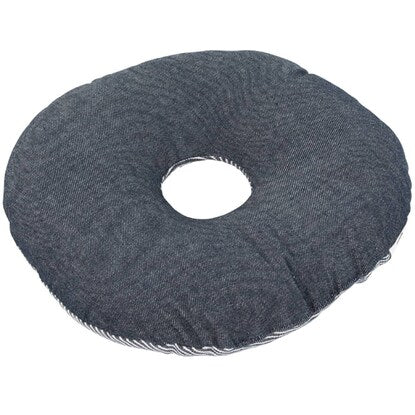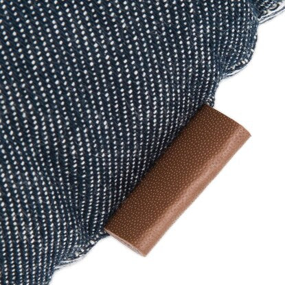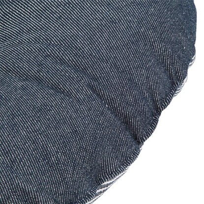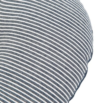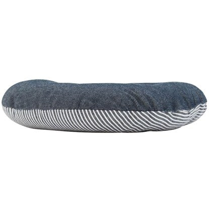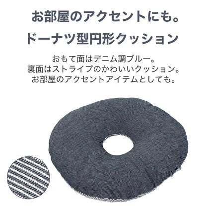 おもて面はデニム調ブルー。裏面はストライプのかわいいクッション。お部屋のアクセントアイテムとしても。