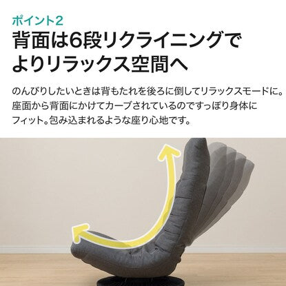 のんびりしたいときは背もたれを後ろに倒してリラックスモードに。座面から背面にかけてカーブされているのですっぽり身体にフィット。包み込まれるような座り心地です。