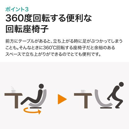 前方にテーブルがあると、立ち上がる時に足がぶつかってしまうことも。そんなときに360℃回転する座椅子だと余裕のあるスペースで立ち上がりができるのでとても便利です。