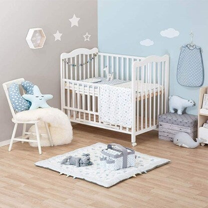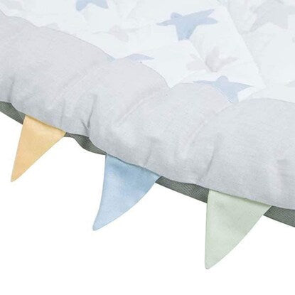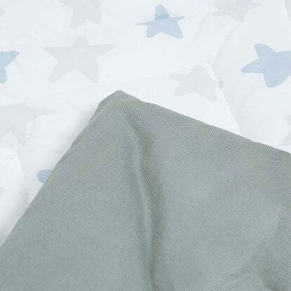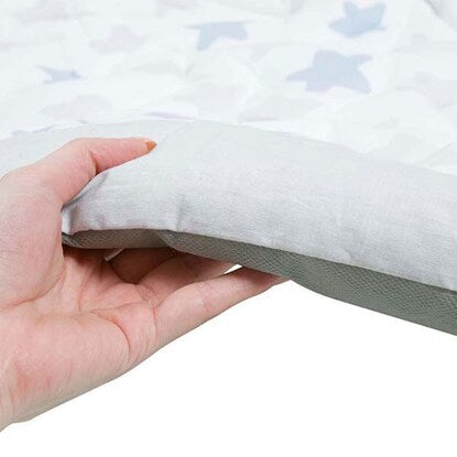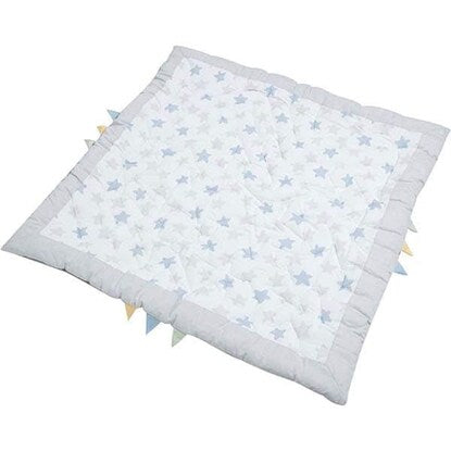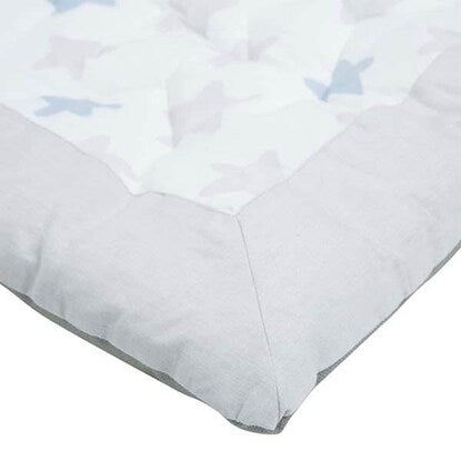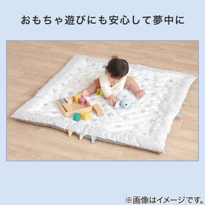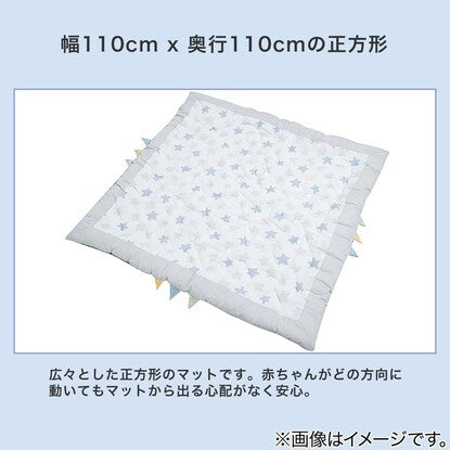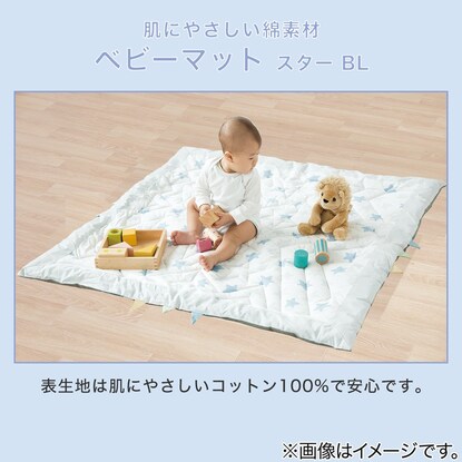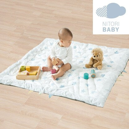 肌にやさしい綿素材 ベビーマット(スター BL) 表生地は肌にやさしいコットン100%で安心です。 幅110cm x 奥行110cmの正方形 広々とした正方形のマットです。赤ちゃんがどの方向に動いてもマットから出る心配がなく安心。 星型のステッチでママも楽しい時間に 落ち着いたライトグレーとブルーの星柄でお部屋になじみやすいデザイン。 ステッチは星型に縫製してあり、みんなの遊び心をくすぐります。端の恐竜の背びれのようなデザインには目線が低い赤ちゃんもウキウキ♪ コットンで心もゆったり ほどよい厚みがあり、ふっくら。表生地にはコットンならではの手触りです。裏生地は不織布ポリプロピレンです。 お手入れ方法は手洗いにて丸洗い可能です。 おもちゃ遊びにも安心して夢中に お部屋もキュートに演出 ※画像はイメージです。 星柄の模様に、ステッチも星柄! 表面は肌に優しい綿100%■組成 表生地:綿100% 裏生地:不織布ポリプロピレン 充填物:ポリエステル100%■手洗い