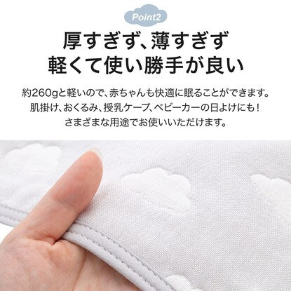 約260gと軽いので、赤ちゃんも快適に眠ることができます。肌掛け、おくるみ、授乳ケープ、ベビーカーの日よけにも!さまざまな用途でお使いいただけます。