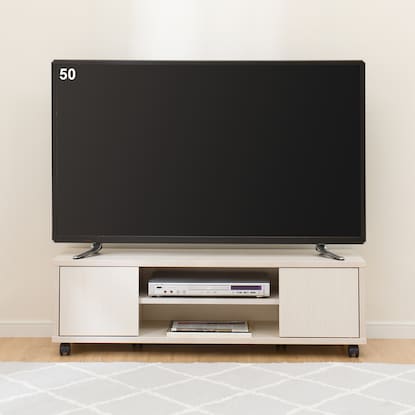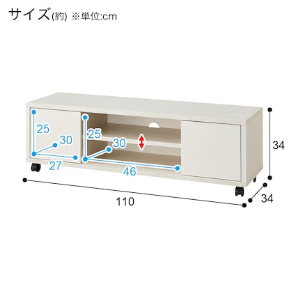 ※実際のサイズ・色・構造 等を保証するものではありません ARについての詳細はこちら配線用の穴でごちゃつくコード類をスッキリとまとめられます。 お掃除や模様替えの際は、キャスター付だからラクラク動かせます。 床から天板までは約34cmなので、寝転んだり床座からでもテレビが観られる高さです。 こちらは幅110cmタイプです。【詳細サイズ(約)】 扉内寸:幅27×奥行30×高さ25cm(左右共通) オープンスペース内寸:幅46×奥行30×高さ25cm※イメージ画像の場合、使用している小物等は演出品です。