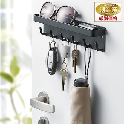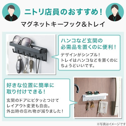 スチール製の玄関扉や壁面に磁石で簡単取り付け トレイに印鑑やペンを置けば荷受時のサインがスムーズに 折り畳み傘を掛けたりサングラスを置いておくのにも便利 壁に取り付ければ、ディスプレイ棚としても【取り付け可能な壁】 板壁・プリント合板(裏側にサンがある場所) ※石こうボード・しっくい・モルタル等のもろい壁・5mm以下の薄い板壁・コンクリート・ブロックレンガ等のかたい壁・タイルおよびタイル目地等では使用しないでください。 ※付属の木ネジを壁にねじ込みますので、プラスドライバーをご用意ください。【付属品】 マグネット ×1 木ネジ ×2【耐荷重(約)】 2kg ※衝撃をゼロとした場合の静止耐荷重です。外寸:幅24.5×奥行4.2×高さ6cm トレイ内寸:幅24×奥行4×高さ1.5cm本体:スチール(粉体塗装)【お手入れについて】 製品に付いた汚れや水分は乾いた布でふき、しっかり乾かしてください。長時間、付着したまま放置するとサビの原因となります。 シンナー・ベンジン等の薬品は塗装を傷めますので、ご使用はおさけください。【取り扱い上のご注意】 マグネットがくっつく凹凸のない平らな面に貼り付けてください。 マグネットは正しく貼り付けてください。落下するおそれがあります。 貼り付けた後、マグネット全面がスチール面に接着し、製品が固定され安定しているか、ご確認の上ご使用ください。 マグネットをスチール面等に取り付ける際、強くこすりつけたり、付けたまま長時間放置しすぎますと、接着面にマグネットの色やキズがつく原因となりますので定期的に接着面を替えてください。 スチール扉に取り付けた際は、扉の開閉は静かに行ってください。強く開け閉めしますと衝撃により落下する恐れがあります。また、開閉の妨げにならないようご注意ください。 ものを収納する際は、重心の偏りのないようバランスよく収納してください。 サイズや形状によっては収納できないものもあります。 貴重品・壊れやすいもの・危険なものは収納しないでください。 耐荷重以上の物は絶対に収納しないでください。耐荷重制限内でも、大きな衝撃により製品が落下し、ケガや破損の原因になることがありますのでご注意ください。 壁面に取り付け時、強度および木ネジのききめが十分か時々確認し、ぐらついてきた場合は、他の場所に取り付けなおしてください。 直射日光や火が直接当たる場所や高温になる所では使用しないでください。