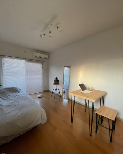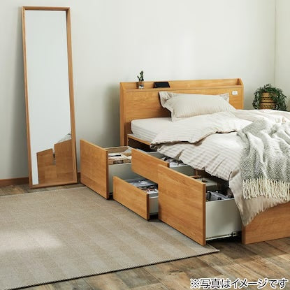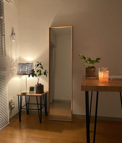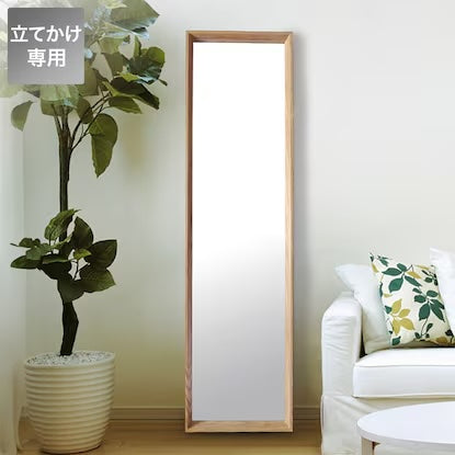 シンプルかつモダンな立てかけ専用ミラーです。転倒防止用ひも付属で安心して使用できます。立てかけ専用なので床に設置した状態でご使用ください。