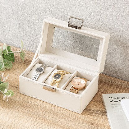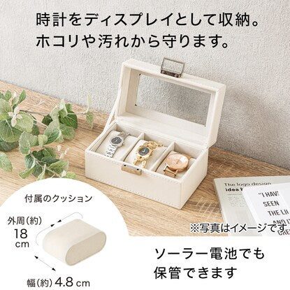 時計をディスプレイとして収納 ホコリや汚れから守ります 天窓がガラスになっているため、ソーラー電池でも保管できます。 ※電波受信にも支障ございません。【収納可能数】 腕時計:3本16.8×10.5×8.5cm塩化ビニル樹脂、ポリエステル、ガラス【取り扱い上のご注意】 すべての腕時計には対応しておりません。お使いの腕時計のサイズをご確認ください。留め具をとめられない場合があります。 本品はガラスを使用しています。取り扱いにご注意ください。 ぬれたものを収納しないでください。