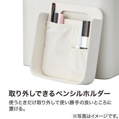 取り外しできるペンシルホルダー付き 使うときだけ取り外して使い勝手の良いところに置ける ふたを開けると小物トレーが持ち上がる ボックスの中に収納した物も取り出しやすい 省スペースなスリムタイプ 場所をとらず、すっきり収納できる17×28×26cm塩化ビニル樹脂、ガラス、ポリエステル、ペーパー【取り扱い上のご注意】 水にぬらしたり、高温多湿の場所に放置しないでください。 強くこすったり、入れた物を内側の生地に長時間密着させないでください。生地の特性上、色移りする可能性があります。 個体差により、サイズに多少の誤差が生じます。