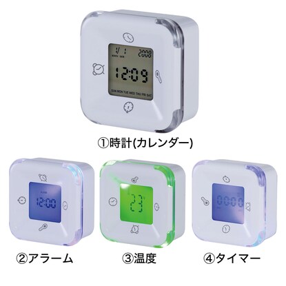 回転させることで4つの機能(時計(カレンダー)、温度、タイマー、アラーム)を切り替えることができます。