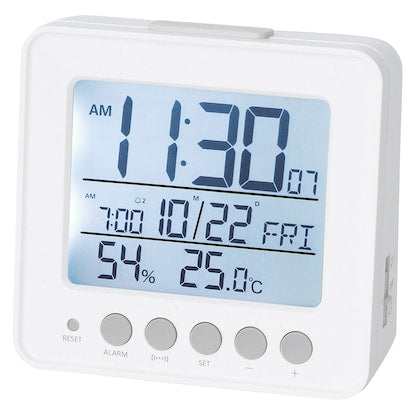 お部屋や好みに合わせてカラーを選べる コンパクトサイズでお部屋に馴染む 2つの時刻をアラーム設定できて平日・休日の使い分けに便利 ライト付き カレンダー表示 温度・湿度表示【使用電池】 単3×2個(別売品) ※充電式電池は使用できません。幅9.5×奥行4×高さ9cmABS樹脂【電波時計について】 電波受信状況が悪かったり、ノイズ電波を拾いやすい場合はアナログクォーツ時計機能に切り替えができます。この場合、電波の誤受信による時間の狂いは発生しません。 離島、または鉄筋、鉄骨の建物の中及び周辺、高圧線・架線の周辺、山の裏側、乗り物の中、電波障害のある場所、家庭用電化製品・OA機器のそばなどでは受信されない、受信しにくい場所があります。窓側などの電波を受けやすい場所でご使用ください。