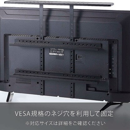 テレビの裏面に簡単取り付け 薄型テレビ上・テレビ裏のデッドスペースを有効活用できる ルーターや外付けHDD、電源タップなど周辺機器をまとめて収納できる 掃除道具の置き場にも。使いたいときにサッと取り出せます VESA規格対応のテレビ裏のネジ穴にねじ込んで固定するだけなので簡単に設置できます ※対応サイズは詳細をご確認ください テレビ裏に隠して収納できるのでテレビ周りをすっきり整理整頓できます 下段には電源タップを置くことができるので配線もすっきり【付属品】 テレビ背面固定用ネジ (M4×10mm・M4×15mm・M6×10mm・M6×15mm・M8×15mm・M8×20mm)×各4 ワッシャー×4 棚板高さ調節ネジ・ナット・ワッシャー ×各4 六角レンチ・スパナ×1外寸:幅70×奥行20×高さ60cm 天板サイズ:幅70×奥行13×高さ1cm 棚板サイズ:幅60×奥行8×高さ3cm ※高さ45cmまで調節可能(2.5cm間隔) 内寸(上段):幅56.5×奥行10.5cm 内寸(下段):幅57×奥行8×高さ10.5cm【対応サイズ】 テレビの高さ:60cm以上 テレビ背面のネジ穴ピッチ:横10~40cm・縦10~45cm(2.5cm間隔)【取付可能なテレビ】 VESA規格対応の40インチ~50インチのテレビを目安としています。【耐荷重(約)】 天板・棚板:各2kg本体:スチール(粉体塗装) マット:シリコーン
