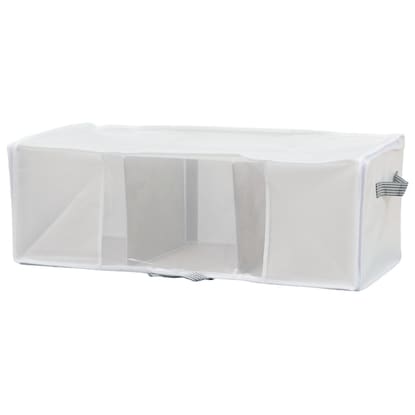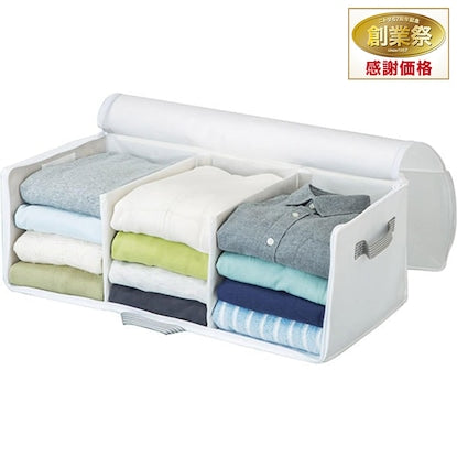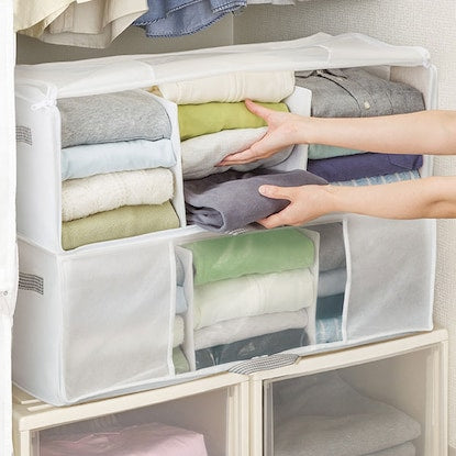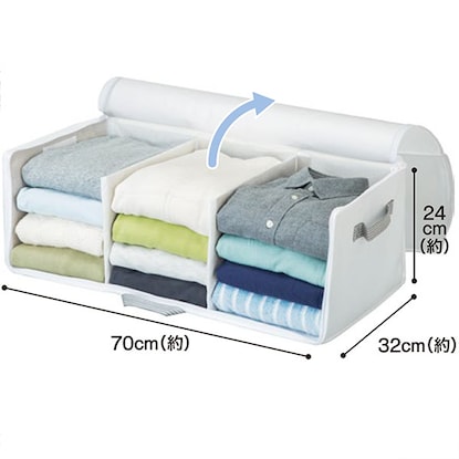 がばっとひらいて出し入れ簡単 全面が開くから収納物を取り出しやすい 全面と天面をいっぺんに開けるから入れやすい! 通気性が良いためカビがつきにくく、保存用に便利です。 収納物がわかる透明窓付きです。 押入れやクローゼットへの出し入れには便利な持ち手付きです。 防虫剤などが入れられるポケットが2ヵ所付いています。■収納の目安:セーター・トレーナーなら約12-15枚