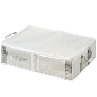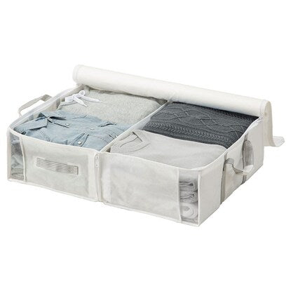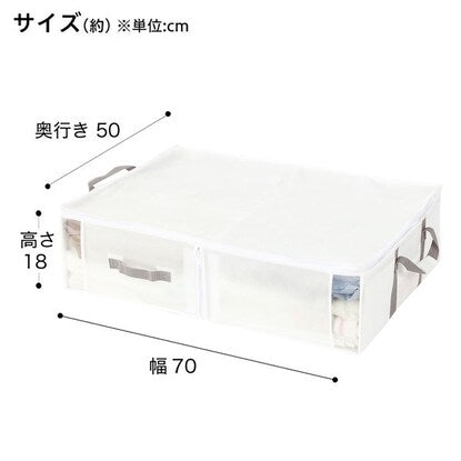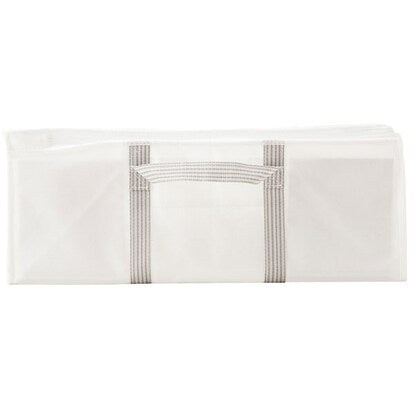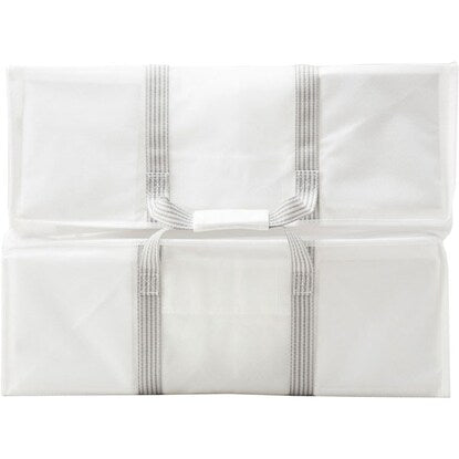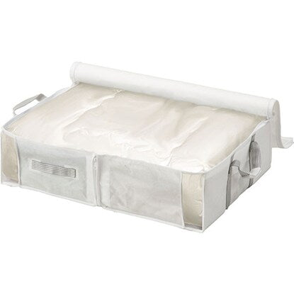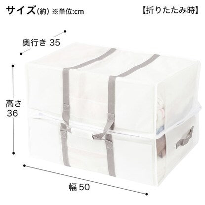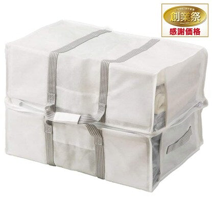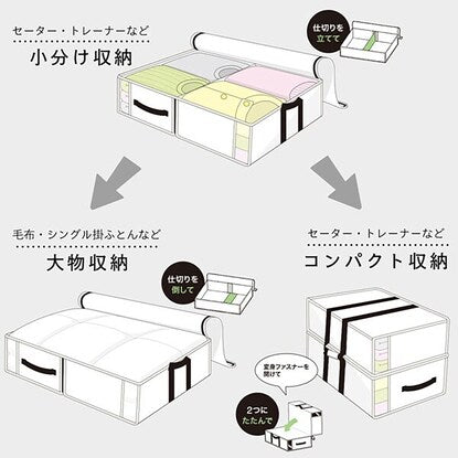3通りに使える衣類・ふとん収納バッグ①真ん中の仕切りを立てて衣類を収納 ■収納の目安:セーターやトレーナー12-16枚②真ん中の仕切りを倒して掛ふとんを収納 ■収納の目安:毛布2-4枚、シングル掛ふとん1枚③変身ファスナーを開けて、収納スペースにあわせてカタチが変わる ※仕切り板を倒して、毛布・シングル掛ふとんなどを収納した場合は2つに折りたたむことはできません。
