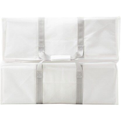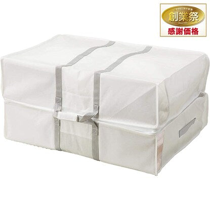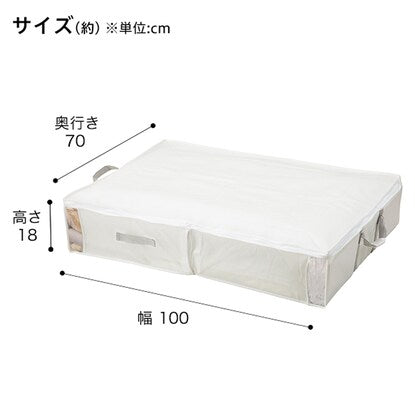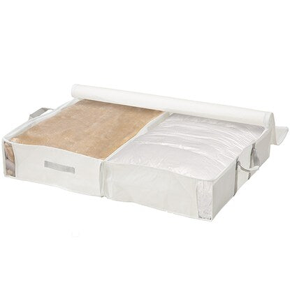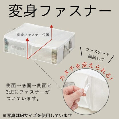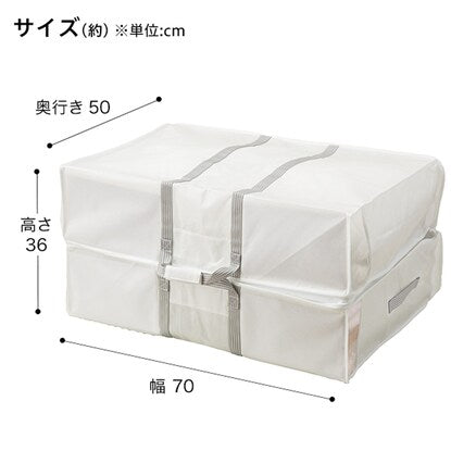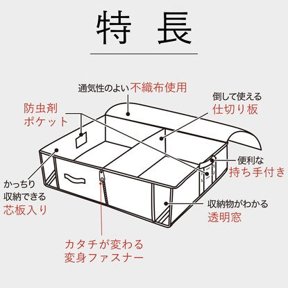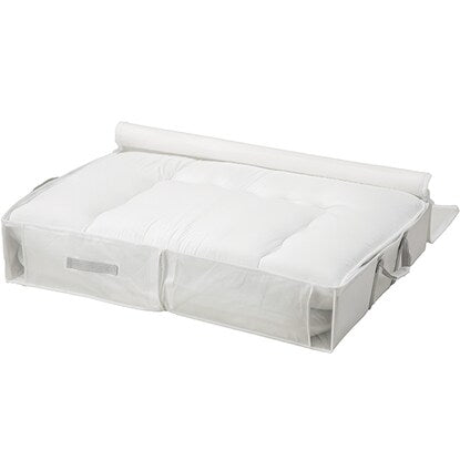 3通りに使えるふとん収納バッグ①真ん中の仕切りを立てて掛ふとんを収納 ■収納の目安:シングル掛ふとん(左右で1枚ずつ)2枚 ※衣類も収納できます②真ん中の仕切りを倒して掛ふとんを収納 ■収納の目安:シングル敷ふとん(3つ折り)1枚③変身ファスナーを開けて、収納スペースにあわせてカタチが変わる ※仕切り板を倒して、敷ふとんなどを収納した場合は2つに折りたたむことはできません。