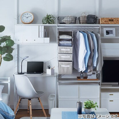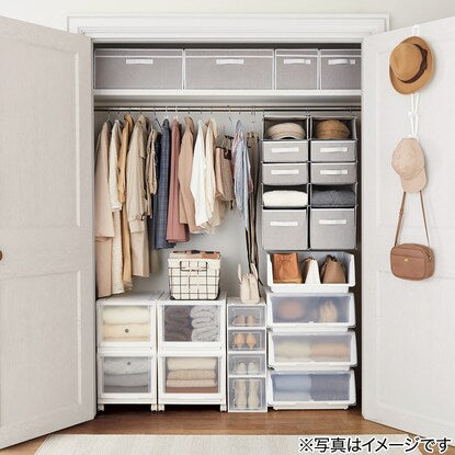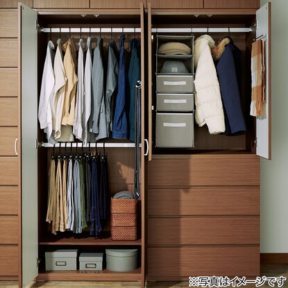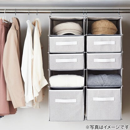 クローゼットをスッキリ収納 下段は大きめでバッグも収納できる! クローゼットのポールで取り付け可能。 シャツやセーターなどの収納に最適。 専用の収納ボックスと組み合わせてさらに便利に。 ※ボックスは別売りです。 8400333 収納ボックス プレッソ(横型ハーフ) 8400334 収納ボックス プレッソ(レギュラーサイズ)