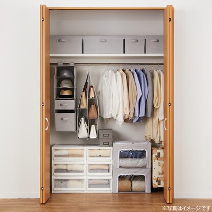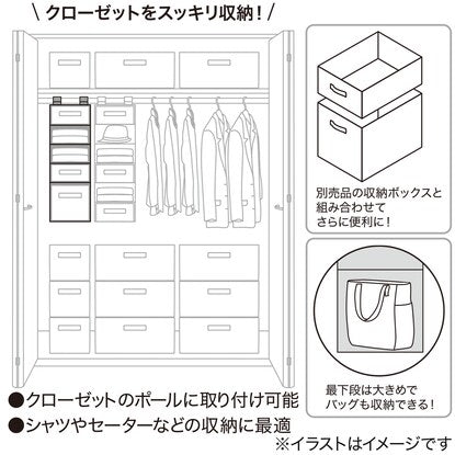 クローゼットのポールに取り付け可能 クローゼットをスッキリ収納できる シャツやセーターなどの収納に最適 別売品の収納ボックスと組み合わせてさらに便利 最下段は大きめでバッグも収納できる幅28×奥行39×高さ91.1(ポール取り付け部を含む)cm耐荷重5㎏までポリエステル、ポリプロピレン、繊維板【取り扱い上のご注意】 摩擦などにより衣類に色移りする場合があります。 火のそばや高温になる場所でのご使用、保管はお止めください。 湿気・水気の多い場所でのご使用、保管はお止めください。