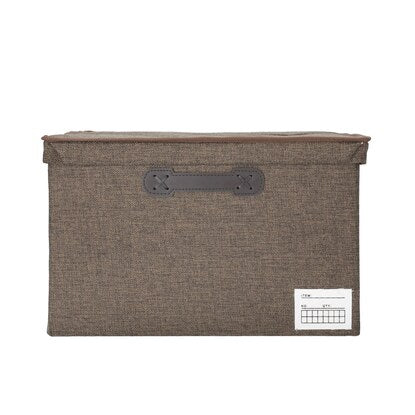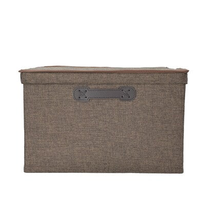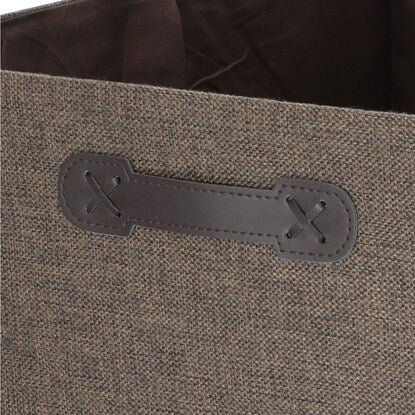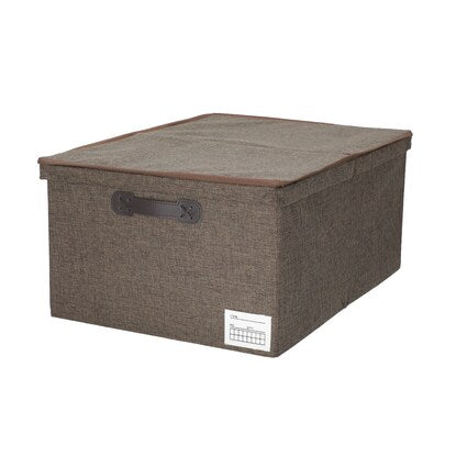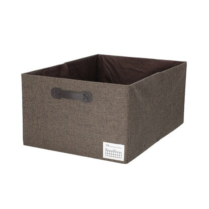 便利なふた付き収納ボックス クローゼットの整理にも表地:ポリエステル100% 裏地:ポリエステル100% 芯材:ペーパー 持ち手:塩化ビニル樹脂【お手入れについて】 水洗いはしないでください。商品の汚れは、水で薄めた中性洗剤をやわらかい布に含ませ、固く絞ってよくふき取り、風通しの良い場所で陰干ししてください。 漂白剤やシンナー、ベンジンなどの薬品は使用しないでください。変色や色落ちの原因になります。【取り扱い上のご注意】 直射日光のあたる場所、高温多湿な場所でのご使用はお止めください。また、火に近づけたり、水をかけたりしないでください。変色、変形、カビの原因になります。 火気の近くでのご使用はお止めください。 においが気になる場合は、風通しの良い場所で陰干ししてください。 熱いものやぬれたもの、水分のあるものは入れないでください。 壁紙や床の材質によってはワックス、湿気などの影響で接触箇所に色移りすることがあります。特にクッションフロアは色移りしやすいため、直置きは避けてご使用ください。 ※材質の特性上、摩擦などで色が落ちる場合があります。 クッションフロアに設置する場合は色移りしやすいため、布を敷くなど直置きをさけてご使用ください。 本品は床や壁の材質や、ワックス、薬品、湿気の影響により、接触箇所に色移りすることがあります。