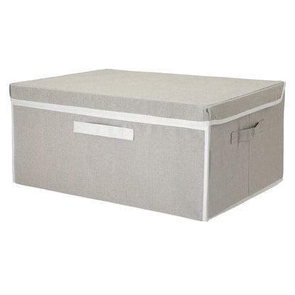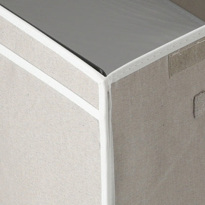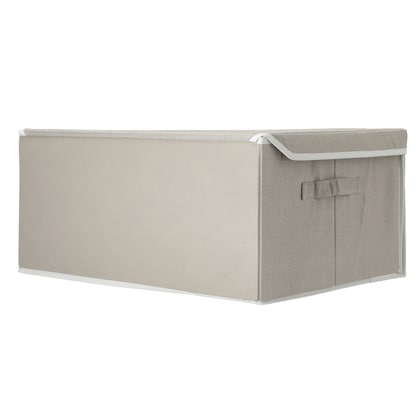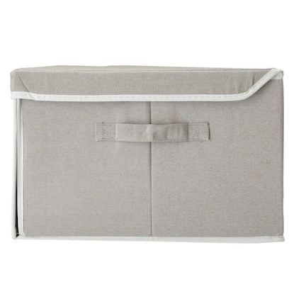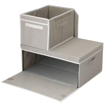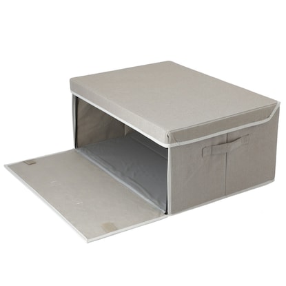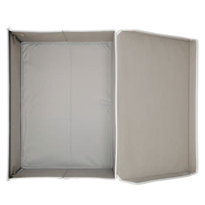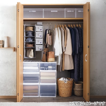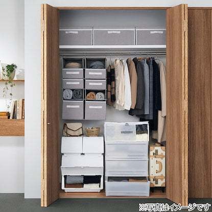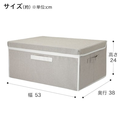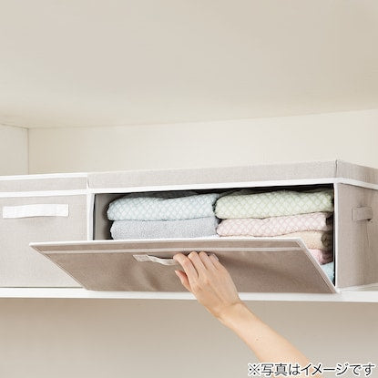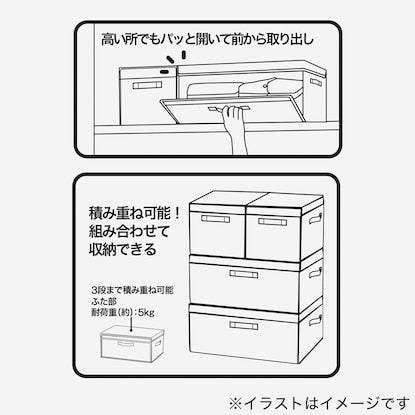 前から取り出し簡単 上にも、パッと開く 組み立てかたを変えると上にも開く 高い所でも 高い所でもパッと開いて前から取り出し 積み重ね可能 組み合わせてスッキリ収納できる 積み重ね目安:3段 サイズ(約)※単位:cm 高い所でもパッと開いて前から取り出しできる 上にもパッと開く ピタッと閉じるマグネット付き 積み重ね可能 ※積み重ね目安:3段【耐荷重(約)】 ふた部:5kgポリエステル、綿、不織布、スチール、紙【お手入れについて】 本品は水洗いできません。 汚れた場合は固く絞った布などでふき取り、よく乾燥させてください。 本品は除湿、防虫、防カビなどの効果はありませんので、ご使用の際は市販品の除湿剤、防虫剤、防カビ剤を入れて使用してください。 また定期的に陰干しすることをおすすめします。【取り扱い上のご注意】 4段以上重ねてのご使用はお止めください。 収納物を無理に押し込んだり、入れすぎたりしないでください。 湿気・水気の多い場所でのご使用・保管はお止めください。 本体には重量物や先のとがったもの、ぬれたもの、湿気のあるものは入れないでください。 摩擦などにより衣類や床に色移りしやすいため、直置きは避けてご使用ください。