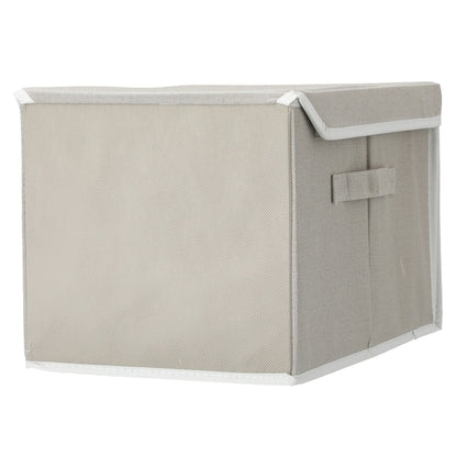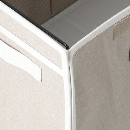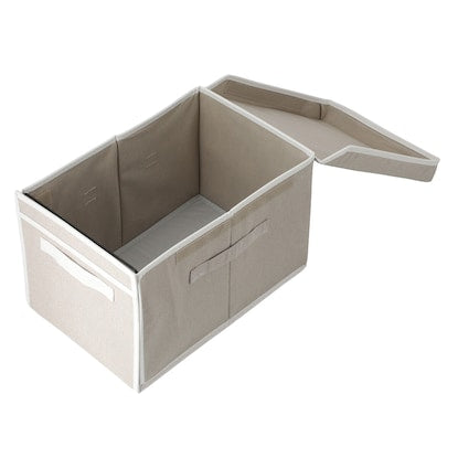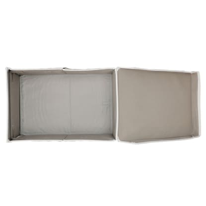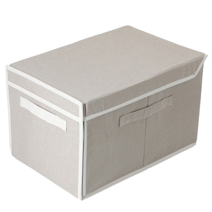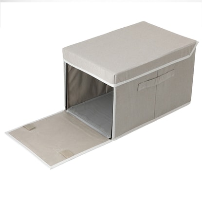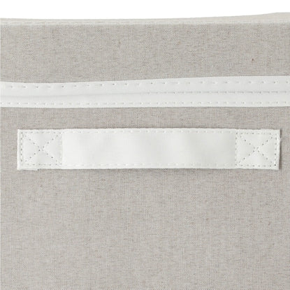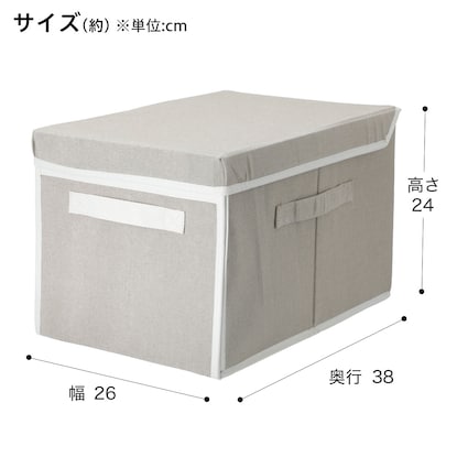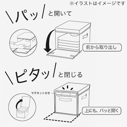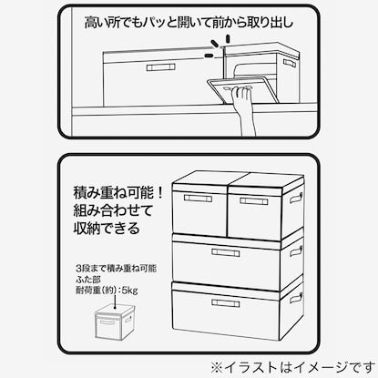 前から取り出し簡単 上にも、パッと開く 組み立てかたを変えると上にも開く 高い所でも 高い所でもパッと開いて前から取り出し 積み重ね可能 組み合わせてスッキリ収納できる 積み重ね目安:3段 サイズ(約)※単位:cm 高い所でもパッと開いて前から取り出しできる 上にもパッと開く ピタッと閉じるマグネット付き 積み重ね可能 ※積み重ね目安:3段【耐荷重(約)】 ふた部:5kgポリエステル、綿、不織布、スチール、紙【お手入れについて】 本品は水洗いできません。 汚れた場合は固く絞った布などでふき取り、よく乾燥させてください。 本品は除湿、防虫、防カビなどの効果はありませんので、ご使用の際は市販品の除湿剤、防虫剤、防カビ剤を入れて使用してください。 また定期的に陰干しすることをおすすめします。【取り扱い上のご注意】 4段以上重ねてのご使用はお止めください。 収納物を無理に押し込んだり、入れすぎたりしないでください。 湿気・水気の多い場所でのご使用・保管はお止めください。 本体には重量物や先のとがったもの、ぬれたもの、湿気のあるものは入れないでください。 摩擦などにより衣類や床に色移りしやすいため、直置きは避けてご使用ください。