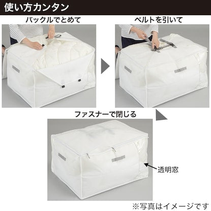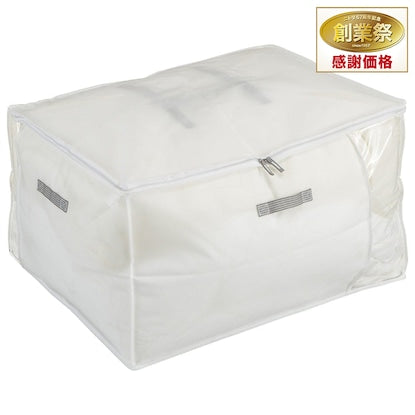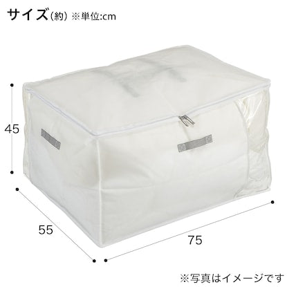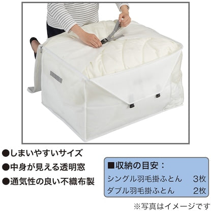 コンパクト収納タイプ よこ幅は、押入れの奥行に、奥行幅はクローゼットの奥行にぴったりでしまいやすいサイズです。 正面と側面の2ヵ所に中身が見える透明窓があり、どちら向きでも自由に置けます。 通気性の良い不織布製・抗菌、消臭、防カビ加工【収納の目安】 シングル羽毛掛けふとん:3枚 ダブル羽毛掛け布団:2枚■Lサイズ(約):75×55×45cm ■材質 本体:ポリプロピレン 窓:EVA樹脂【取り扱い上のご注意】 ・抗菌、消臭、防カビ加工は使用される状況、条件により異なりますが、効果は開封後6ヵ月を目安にしてください。抗菌、消臭、防カビの持続期間を過ぎてもそのまま保存用としてご使用いただけます。 ・サイズや厚みが特殊な収納物は、入らない場合があります。 ・洗濯、水拭ぶき、アイロン掛けはお止めください。 ・不織布の特性上、強く引っ張ると破れるおそれがありますのでご注意ください。