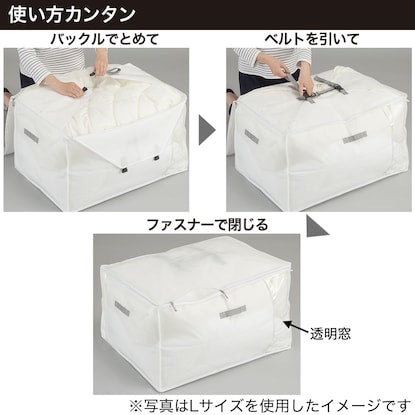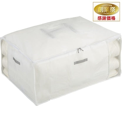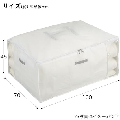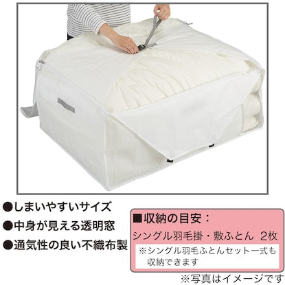 コンパクト収納タイプ 大容量でシングル羽毛ふとんセットも収納できる 奥行の幅は押入れの奥行にぴったりでしまいやすいサイズです。 正面と側面の2ヵ所に中身が見える透明窓があり、どちら向きでも自由に置けます。 通気性の良い不織布製・抗菌、消臭、防カビ加工【収納の目安】 シングル羽毛掛・敷ふとん:2枚 ※シングル羽毛ふとんセット一式も収納できます。■LLサイズ(約):100×70×45cm ■材質 本体:ポリプロピレン 窓:EVA樹脂【取り扱い上のご注意】 ・抗菌、消臭、防カビ加工は使用される状況、条件により異なりますが、効果は開封後6ヵ月を目安にしてください。抗菌、消臭、防カビの持続期間を過ぎてもそのまま保存用としてご使用いただけます。 ・サイズや厚みが特殊な収納物は、入らない場合があります。 ・洗濯、水拭ぶき、アイロン掛けはお止めください。 ・不織布の特性上、強く引っ張ると破れるおそれがありますのでご注意ください。