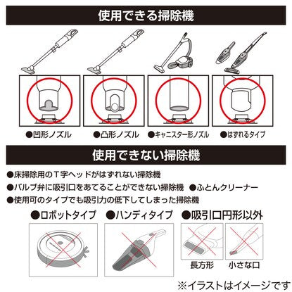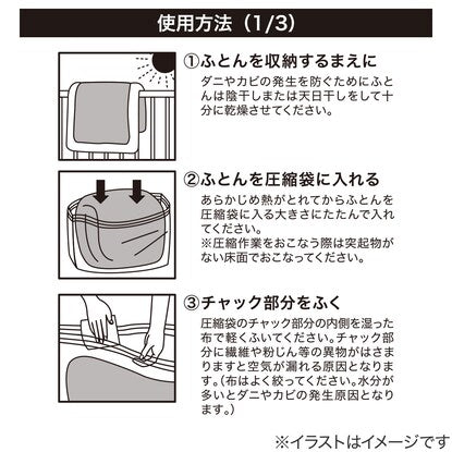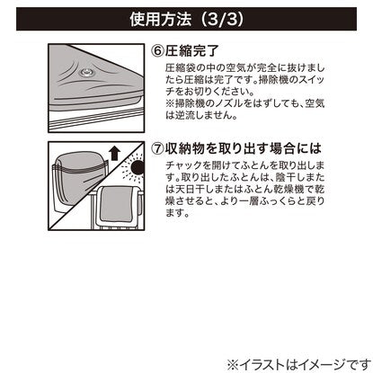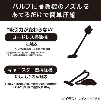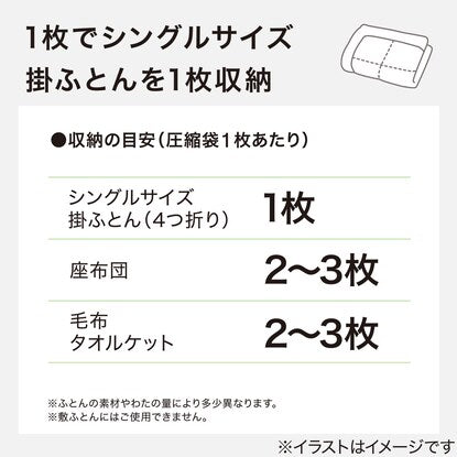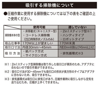 1枚でシングルサイズ掛ふとんを1枚収納 掃除機圧縮タイプ バルブにノズルをあてるだけで簡単圧縮できる 凹凸形特殊形状ノズルに対応 コードレス掃除機使用可能 ※充電式のハンディ型・スティック型クリーナーや吸引力の弱い掃除機にはご便用できません。 キャニスター型掃除機も使用可能 チャックの密封状態がひと目で分かるカラーチャック※お買い上げの際には、ご使用になる掃除機のノズルの形状をご確認ください。【数量】 2枚入り【サイズ】 1枚あたり:(約)幅110×高さ100cm【収納の目安】(圧縮袋1枚あたり) シングルサイズ掛ふとん(4つ折り):1枚 座布団:2~3枚 毛布、タオルケット:2~3枚※ふとんの素材やわたの量により多少異なります。 ※敷ふとんにはご使用できません。【使用できる掃除機】 掃除機本体の型 ・床移動型(キャニスター型)の掃除機 ・コードレス掃除機(凹凸特殊形状ノズルのみ) 吸込仕事率:170W以上が望ましい 吸引口寸法:内径30mm~45mm ※吸引口寸法が30-45mmでも吸引口の形状が長方形のタイプはアダプタに合わないため、吸引できません。 吸引方法が紙パック方式/サイクロン方式の掃除機【使用できない掃除機】 掃除機本体の型 ・2inスティックタイプ掃除機 ※2inlスティック型掃除機は取り外した吸引口が異形のため、アダプタに合わないので吸引作業ができません。 ・ハンディタイプ掃除機 ・ロボットタイプ掃除機 床掃除用のT字ヘッドがはずれない掃除機 バルブ弁に吸引口をあてることができない掃除機 ふとんクリーナー 使用可のタイプでも吸引力の低下してしまった掃除機 吸込仕事率:170W未満 吸引口形状:円形以外(長方形や小さな口のもの等) 吸引口寸法:内径30mm未満および45mm以上 吸引方法が排気循環式の掃除機 ※排気循環式は吸引口に排気口があり、圧縮作業時に吸引しながら空気を送り込むため、圧縮が上手くできません。※掃除機で2分以上、吸引をすると掃除機に負担がかかり故障の原因になります。 (吸引時間の目安は1分以内です。掃除機が止まった場合は、コンセントをぬいて熱を冷ませば、再び使用することができます。) 圧縮作業を連続して2枚以上行う場合は、掃除機の熱が冷めてから行ってください。 掃除機内のゴミはご使用前に必ず捨ててください。吸引力が低下して圧縮ができなかったり、モーターに負担がかかって故障の原因となるおそれがあります。【取り扱い上のご注意】 羽根製品には使用できません。羽根が折れて、ふとんや圧縮袋を傷付けてしまいます。 ダウン80%以下、フェザー20%以上のふとん製品は使用できません。 本品に薬剤(防虫剤・防カビ剤)を使用しないでください。 保存期間は約6ヵ月です。6ヵ月を過ぎても圧縮状態に異常がなければ、そのまま保存できます。但しその場合は回復率が多少悪くなります。収納物のためには、6ヵ月に1度圧縮袋から出し天日干しをして再度圧縮し直してください。