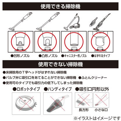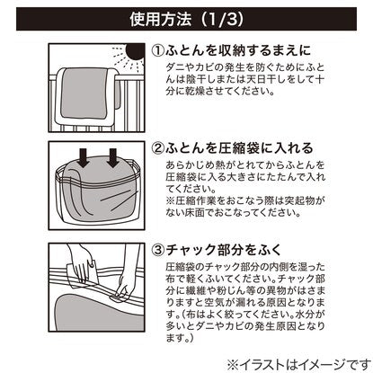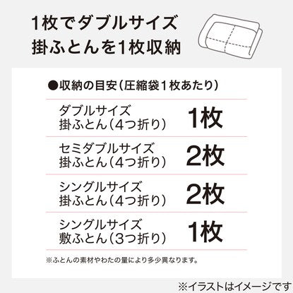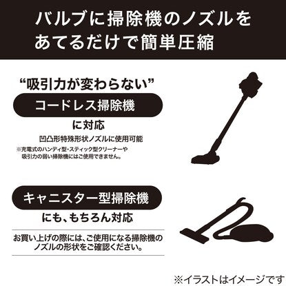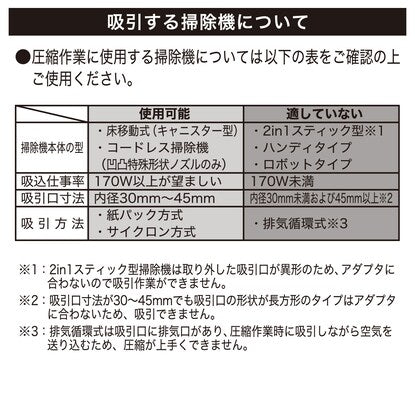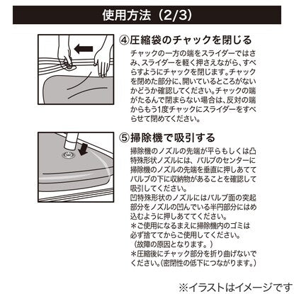 1枚でダブルサイズ掛ふとんを1枚収納 掃除機圧縮タイプ バルブにノズルをあてるだけで簡単圧縮できる 凹凸特殊形状ノズルにも対応 コードレス掃除機使用可能 ※充電式のハンディ型・スティック型クリーナーや吸引力の弱い掃除機にはご便用できません。 キャニスター型掃除も使用可能 チャックの密封状態がひと目で分かるカラーチャック※お買い上げの際には、ご使用になる掃除機のノズルの形状をご確認ください。【数量】 2枚入り【サイズ】 1枚あたり:(約)幅150×高さ100cm【収納の目安】(圧縮袋1枚あたり) ダブルサイズ掛ふとん(4つ折り):1枚 セミダブルサイズ掛ふとん(4つ折り):2枚 シングルサイズ掛ふとん(4つ折り):2枚 シングルサイズ敷ふとん(3つ折り):1枚※ふとんの素材やわたの量により多少異なります。【使用できる掃除機】 掃除機本体の型 ・床移動型(キャニスター型)の掃除機 ・コードレス掃除機(凹凸特殊形状ノズルのみ) 吸込仕事率:170W以上が望ましい 吸引口寸法:内径30mm~45mm ※吸引口寸法が30-45mmでも吸引口の形状が長方形のタイプはアダプタに合わないため、吸引できません。 吸引方法が紙パック方式/サイクロン方式の掃除機【使用できない掃除機】 掃除機本体の型 ・2inスティックタイプ掃除機 ※2inlスティック型掃除機は取り外した吸引口が異形のため、アダプタに合わないので吸引作業ができません。 ・ハンディタイプ掃除機 ・ロボットタイプ掃除機 床掃除用のT字ヘッドがはずれない掃除機 バルブ弁に吸引口をあてることができない掃除機 ふとんクリーナー 使用可のタイプでも吸引力の低下してしまった掃除機 吸込仕事率:170W未満 吸引口形状:円形以外(長方形や小さな口のもの等) 吸引口寸法:内径30mm未満および45mm以上 吸引方法が排気循環式の掃除機 ※排気循環式は吸引口に排気口があり、圧縮作業時に吸引しながら空気を送り込むため、圧縮が上手くできません。※掃除機で2分以上、吸引をすると掃除機に負担がかかり故障の原因になります。 (吸引時間の目安は1分以内です。掃除機が止まった場合は、コンセントをぬいて熱を冷ませば、再び使用することができます。) 圧縮作業を連続して2枚以上行う場合は、掃除機の熱が冷めてから行ってください。 掃除機内のゴミはご使用前に必ず捨ててください。吸引力が低下して圧縮ができなかったり、モーターに負担がかかって故障の原因となるおそれがあります。【取り扱い上のご注意】 ダウン80%以下、フェザー20%以上のふとん製品は使用できません。 本品に薬剤(防虫剤・防カビ剤)を使用しないでください。 保存期間は約6ヵ月です。6ヵ月を過ぎても圧縮状態に異常がなければ、そのまま保存できます。但しその場合は回復率が多少悪くなります。収納物のためには、6ヵ月に1度圧縮袋から出し天日干しをして再度圧縮し直してください。