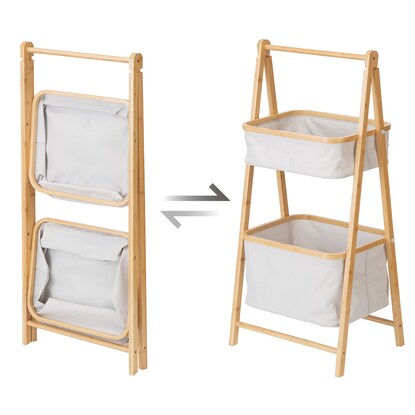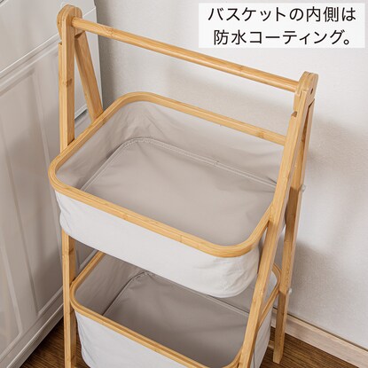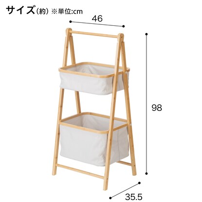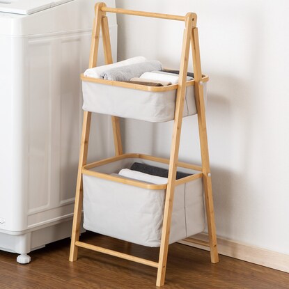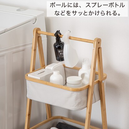 ランドリールームの整理に最適 軽くて丈夫な竹製収納ラック 使わない時は、バスケットごと折り畳んですき間に収納できる 壁に立てかけても薄いので邪魔にならない 洗面周りのタオルや小物の収納に便利 最上部のポールには、スプレーボトルなどをサッとかけられる バスケットの内側は防水コーティング【同シリーズの商品はこちら】 組立目安(1人):約5分 工具不要幅46×奥行35.5×高さ98cm【耐荷重(約)】 ポール:2kg バスケット(浅型):1kg バスケット(深型):2kg本体:竹 バスケット:竹、ポリエステル