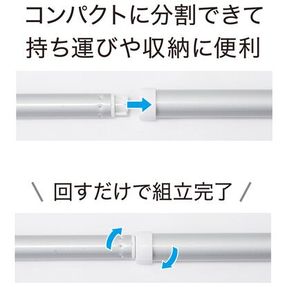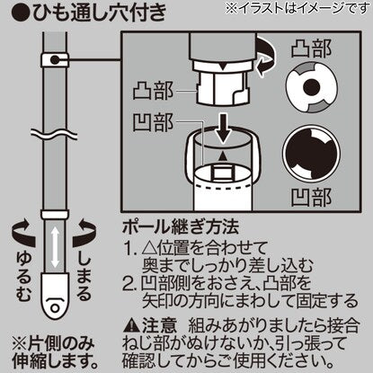 持ち運びやすいジョイント式 軽くてサビにくい 竿の両端が伸縮します ひも通し穴付き【伸縮幅(約)】 2.8~4.0m【パイプ径(約)】 細パイプ:25mm 太パイプ:29mm【耐荷重(約)】 8kg本体:アルミニウム合金 樹脂部:ABS樹脂【取り扱い上のご注意】 耐荷重の範囲内で均等に掛かけ、1ヵ所に集中してかけないでください。 無理な力を加えたり、急な力を加えないでください。 強風時は使用しないでください。 洗濯物をかけたままの状態で移動させないでください。 竿の両端はかならず竿受け具より十分、外側に出して使用してください。 伸縮部は、しっかりと固定された状態になっていることを確認した上で使用してください。