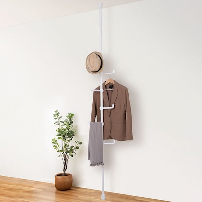 つっぱったままフック位置が変えられる! 高さ200~266cmまで伸縮可能 ・お客様組立品(工具不要) ・組み立て目安(2人以上):約20分■サイズ(約) 幅19×奥行19cm×高さ(伸縮)200~266cm ■ジャッキ部分の直径(約):5cm ■耐荷重(約) 全体:18kg フック1本あたり:3kg ■主な材質 ポール:スチール(粉体塗装) 樹脂部分:ABS樹脂【取り扱い上のご注意】 ※壁から15cm以上離して設置してください。 ・必ず2人以上で支えながら組み立ててください。 ・取り付け場所の床、天井が突っ張り用品に対応できるかどうかを住宅メーカー、不動産会社等に確認してから設置してください。 ・塩化ビニル製のクロス等は、破れやすいものがあるので気を付けてください。破れや傷防止のため設置面に無色の綿素材の当て布の仕様をおすすします。 ・天井と床の強度を確認した上で取り付けてください。圧着力不足で耐荷重が下がるおそれがあります。 ・支柱は必ず垂直に取り付けてください。和室の天井、傾斜した天井、床には取り付けないでください。 ・カーペットや柔らかい床には取り付けないでください。転倒し、天井や床を破損する原因になります。 ・ベランダや屋外での保管は絶対にしないでください。サビの原因になります。 ・火気や暖房器具(ストーブなどの近く)のそばに設置しないでください。 ・本体にぶら下がったり、寄り掛かったり、飛び乗ったり、余計な力を加えたりしないでください。 ・本体に固い物、重たい物を掛けないでください。片寄った荷重をかけずに本体に均等に掛けてください。 ・パイプのジョイント部で指などを挟まないように注意してください。 ・床面がフローリングや畳の場合、傷がつかないよう注意してください。 ・耐荷重の範囲内で使用してください。 ・湿気、水気の多い場所は避け、通気性の良い場所に置いてください。 ・表面を水気の多いぞうきんなどでふかないでください。クレンザー、シンナー、ベンジン、アルコール、灯油は使わないでください。(化学ぞうきんはその注意書きに従ってください)