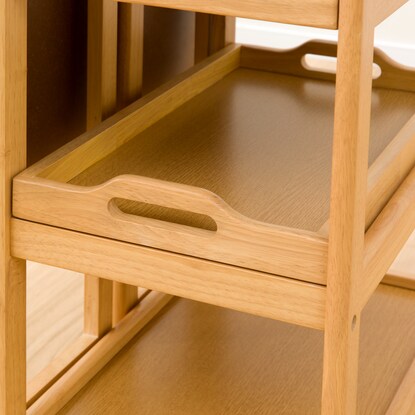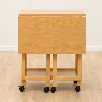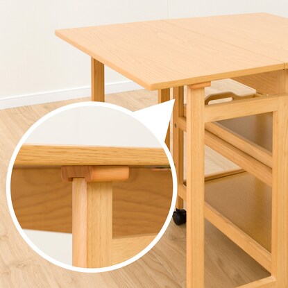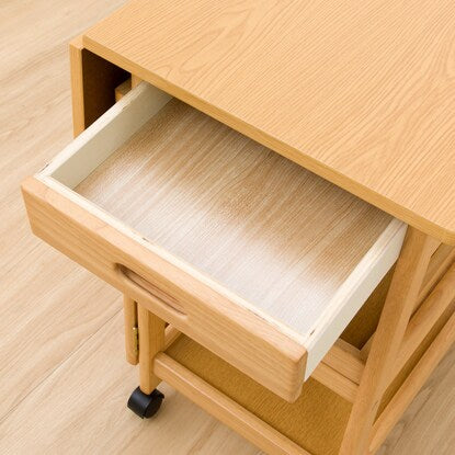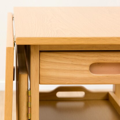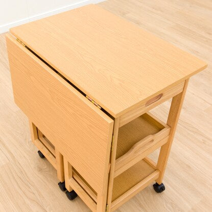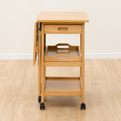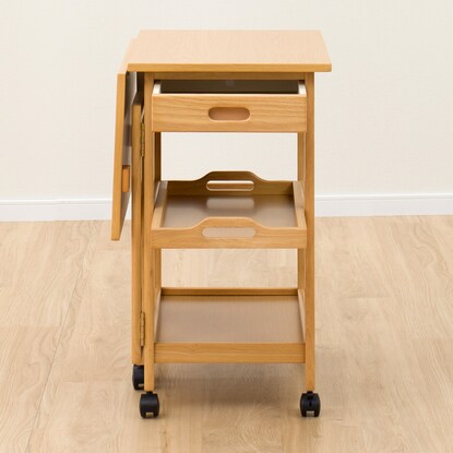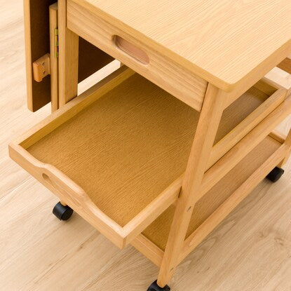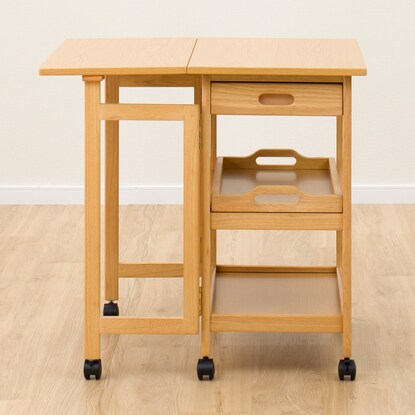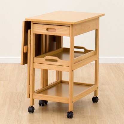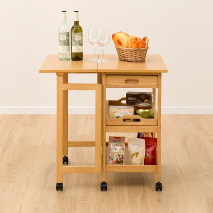 天板を必要に応じて伸長できるワゴン。 ダイニングテーブルとほぼ同じ高さなので、サブテーブルとしても使えます。 折りたたみで伸長でき、最大幅73cmまで広がります。 お鍋や焼肉時の食材置き場など、補助テーブルとしても使用可能です。移動が簡単にできるキャスター脚は、ストッパー付きで安心。 天板下には、カトラリーなどを入れられる引出しや、取り外しできるトレー付きです。※イメージ画像の場合、使用している小物等は演出品です。