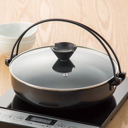 4~5人用(26cm) アルミ鍋で熱電率が高いのでお肉に火が通りやすい 口が広く、水分が蒸発しやすいので水っぽくなりにくい すきやき以外に煮込み料理や、餃子を焼くのもおすすめ 持ち運びやすく移動に便利なツル付き 箸を一時置きできるつまみ形状【品質表示(なべ)】 材料の種類 本体:アルミニウム合金 はり底:ステンレス鋼(クロム13%) (底の厚さ2.6mm(はり底含む)) その他材料 ハンドル:スチール(焼付け塗装) 表面加工 内面:ふっ素樹脂塗膜加工 外面:焼付け塗装 寸法:26cm 満水容量:3.0L【品質表示(ガラスふた)】 品名:強化ガラス製器具 強化の種類:全面物理強化 その他の材料 つまみ:フェノール樹脂(耐熱温度150℃) 縁リング:ステンレス鋼(クロム17%、ニッケル4%)※衝撃に強い強化ガラス製ですが、熱に強い耐熱ガラスではありませんので、高温のときに、水など(水やぬれたふきんなど)をかけたりして急冷させないでください。【その他仕様】 ガス火:使用可 IH(200V/100V):使用可 ※200Vは中火以下※金属ヘラ:使用不可