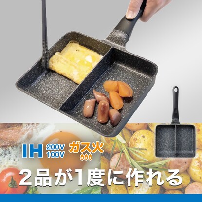 2品を同時調理できる お弁当作りに便利 金属ヘラ使用OK ※金属ヘラをご使用時は、角の丸い滑らかなものをお使いください。 【品質表示】 表面加工 内面:ふっ素樹脂塗膜加工 外面:(底面を除く)焼き付け塗装 材料の種類 本体:アルミニウム合金 はり底:ステンレス鋼(クロム16%) (底の厚さ3.2mm(はり底を含む)) その他材料 ハンドル:フェノール樹脂(耐熱温度150℃)、ナイロン(耐熱温度150℃) 寸法:16×20cm 【その他仕様】 食洗機:使用不可