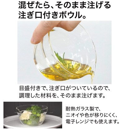 目盛り付きで、注ぎ口がついているので、調理した材料をそのまま注げます