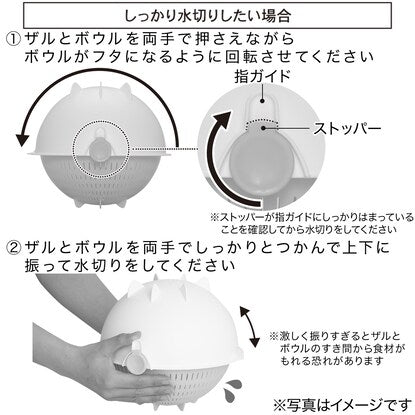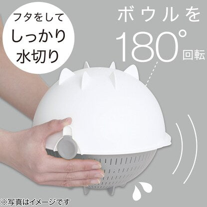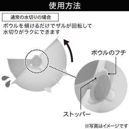 ボウルを傾けるだけでザルが回転して水切りがラクにできます