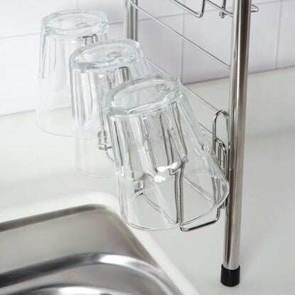 別売りの水が流れる水切りと伸縮シンク上ラックに取り付けできます。
