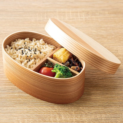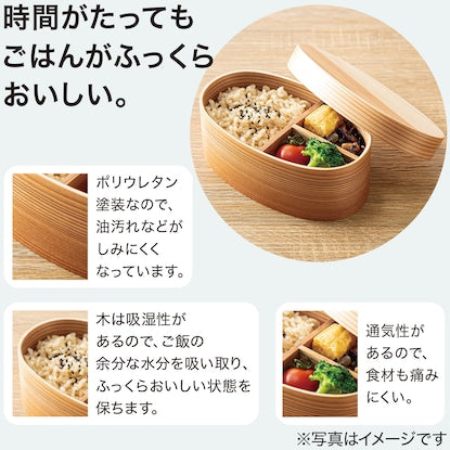 時間がたってもごはんがふっくらおいしい 木は吸湿性があるので、ご飯の余分な水分を吸い取り、ふっくらおいしい状態を保ちます 通気性があるので、食材も痛みにくい ポリウレタン塗装なので、油汚れなどがしみにくくなっています【セット内容】 本体 ふた バンド17×11×高さ6cm ※天然木で手作りのため、サイズに誤差があります。素地の種類:天然木(杉) 表面塗装の種類:ウレタン塗装【その他仕様】 オーブン:使用不可 電子レンジ:使用不可 食洗器:使用不可【お手入れについて】 使用後は、薄めた台所用洗剤を浸したやわらかいスポンジで十分に洗い、水気をよくふき取り、十分に乾燥させてください。 カビ・ぬめり、変色などを防ぐために定期的にお手入れすることをおすすめします。 浸け置き洗いはしないでください。 塩素系漂白剤、シンナー、ベンジン、金属たわし、磨き粉は使用しないでください。【取り扱い上のご注意】 熱い食材は入れないでください。必ず冷ました状態の食材を入れてください。熱がこもったり、湿気が発生し、食材などの品質を損なう可能性があります。 汁物や液体を含んだものを入れないでください。本体が傾かないように注意してください。 付属のバンドで留めてください。密閉容器ではないため、傾けると中身が漏れ、汚れなどの原因になります。 長期間ご使用にならない場合は、きれいに洗って汚れを落とし、十分に乾燥させて高温多湿の場所をさけて保管してください。色移りなど、変色の原因になります。 においの強い物や色素の濃い食材はラップフィルムやクッキングホイルなどに包んでください。色移りなど、変色の原因になります。