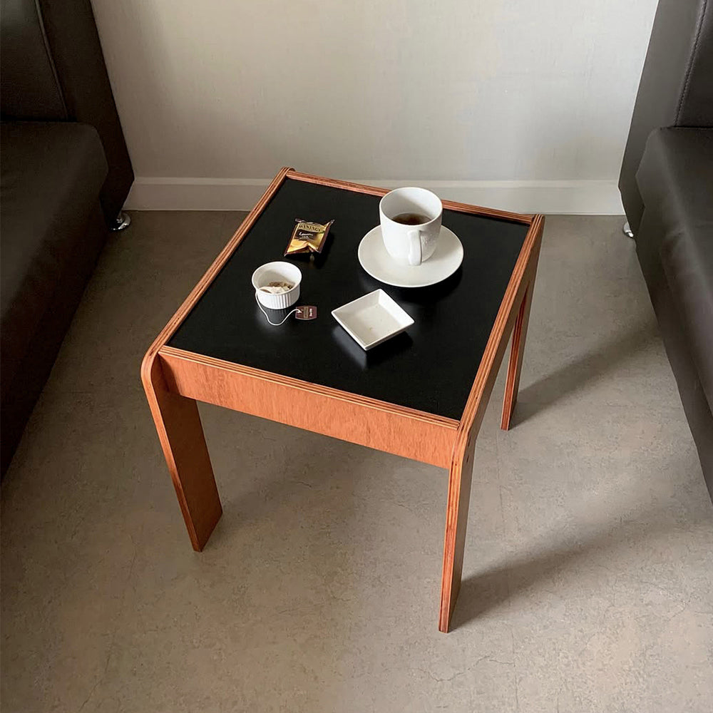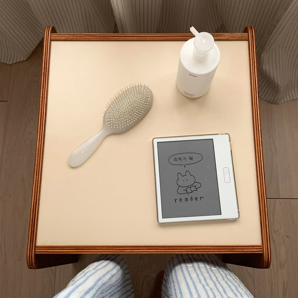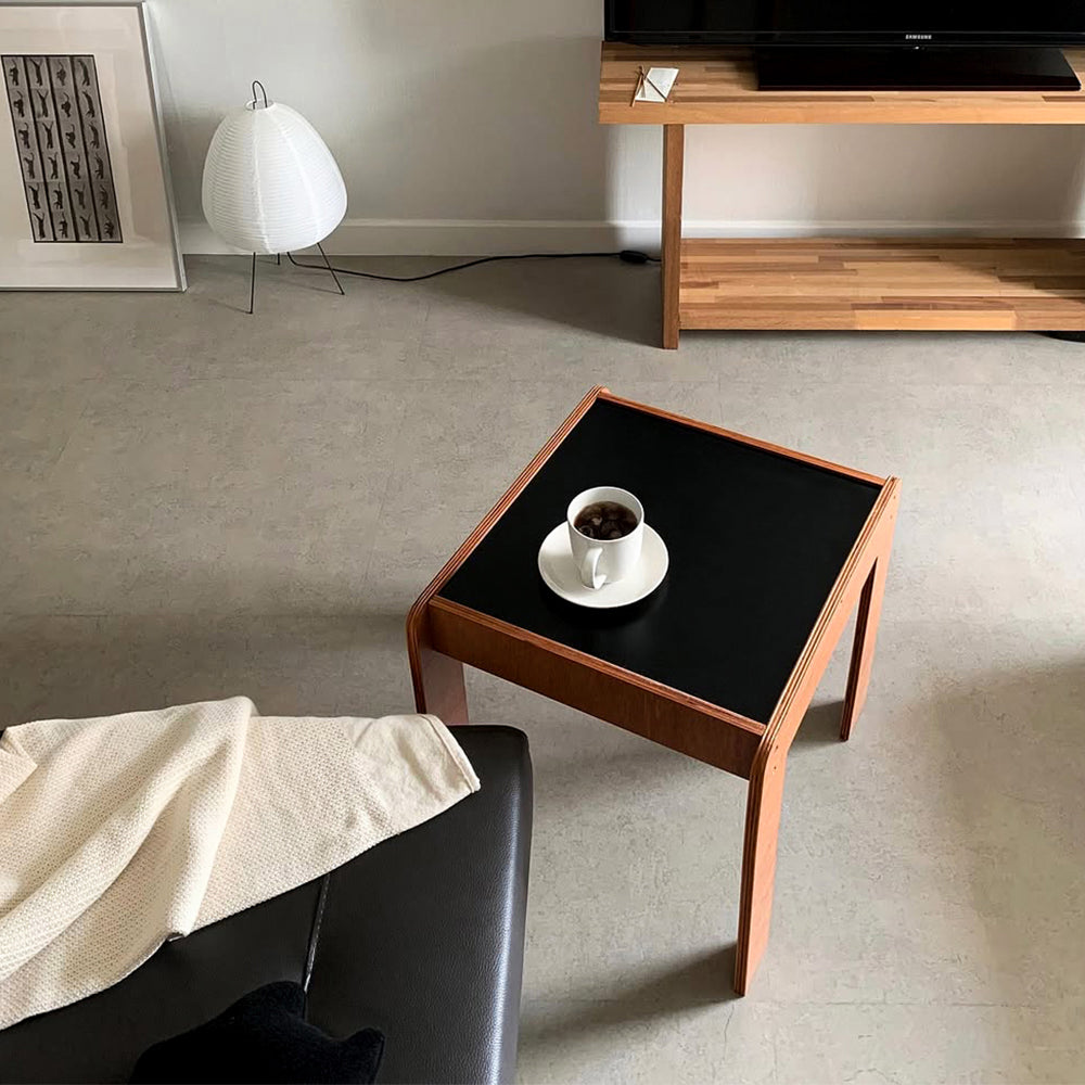 曲線と木目の美しさが映えるサイドテーブル。Ogreのキューブブレッドは、ナチュラル空間に温かみを添えるアクセントに。