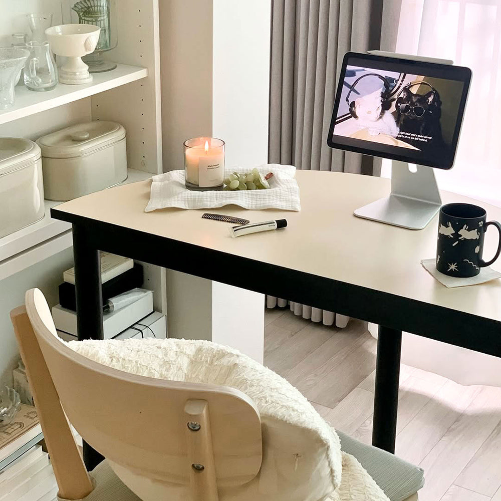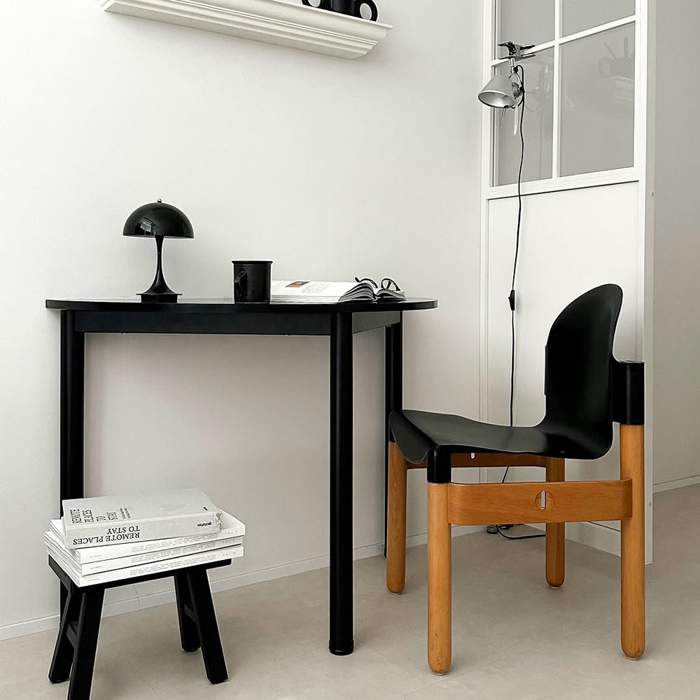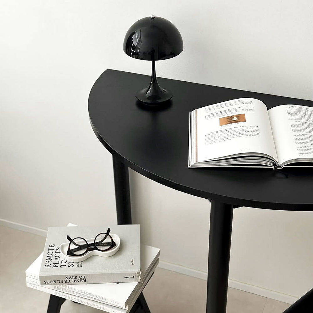 Ogreのハーフムーンテーブルは、滑らかな半月ラインが特徴。省スペースでも使いやすく、空間にやさしい抜け感を。