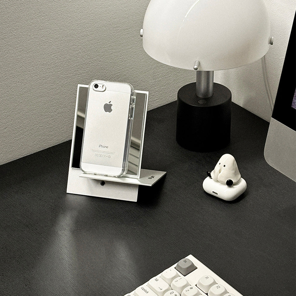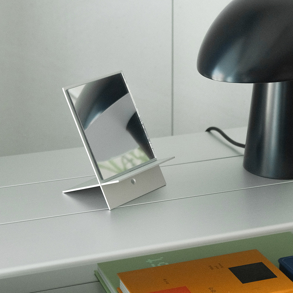 Ogreのミニシェルススタンドミラーは、上品さ漂うミニマルデザイン。持ち運びやすく、省スペースにもすっきり収まる。