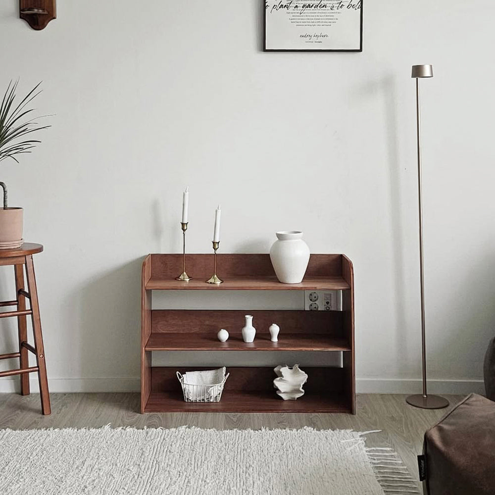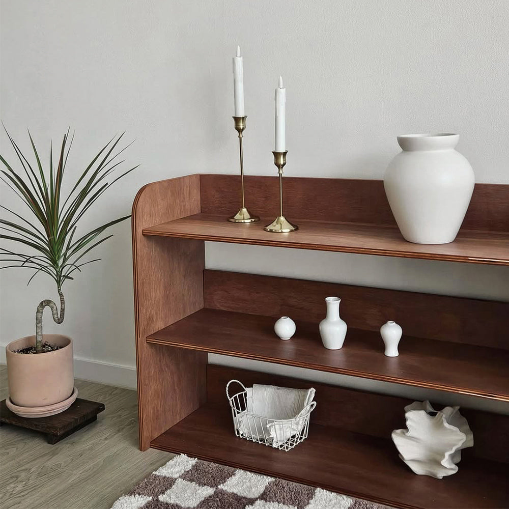 温かみのあるクラシックなカラー感の高級感漂うオンギョルウッドキャビネット なめらかな曲線ラインのオンギョルウッドキャビネットは、オープン収納が可能で原木の自然な木目を活かし、空間に自然に溶け込みます。