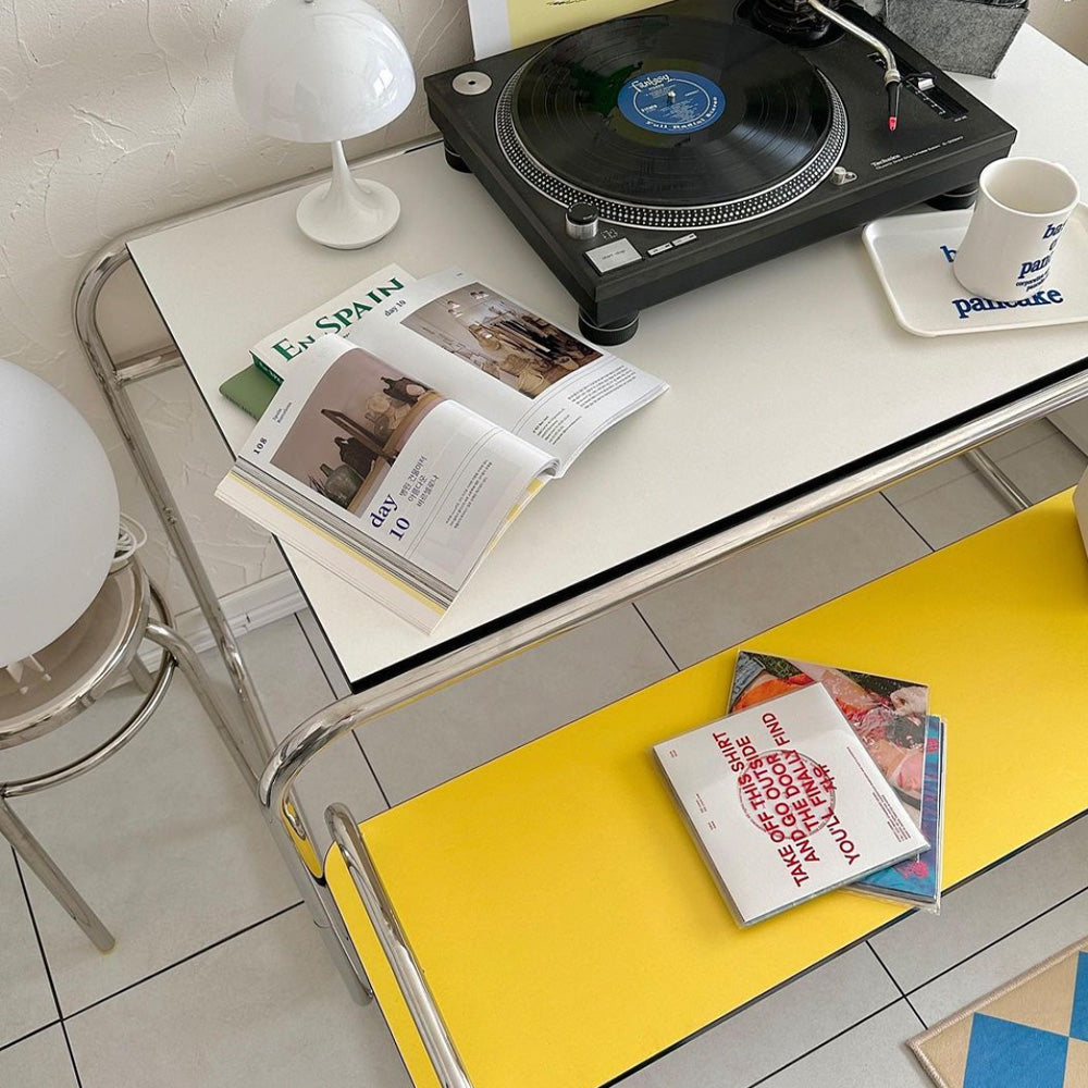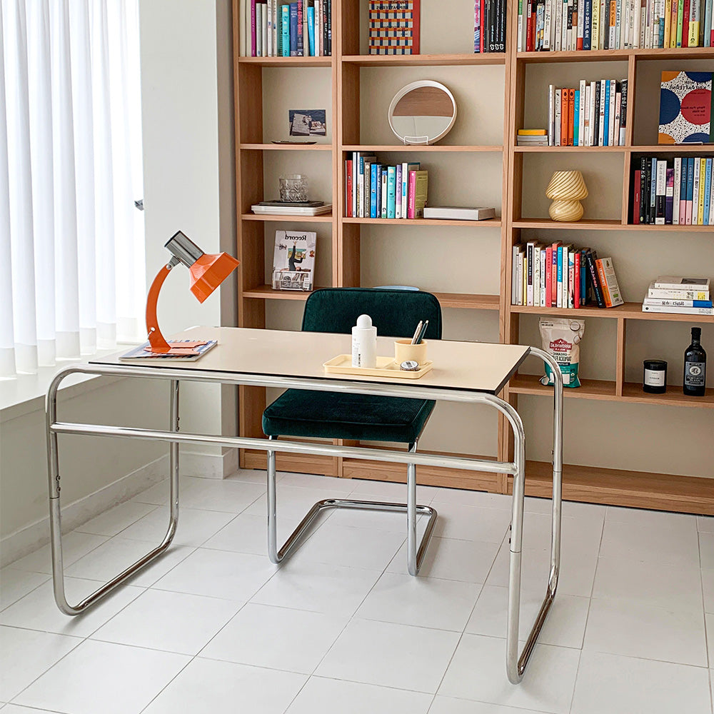ステンレスバンディングオフィステーブルはミッドセンチュリー感性あふれる家具で 広いテーブルにユニークなデザインが特徴の家具です。
