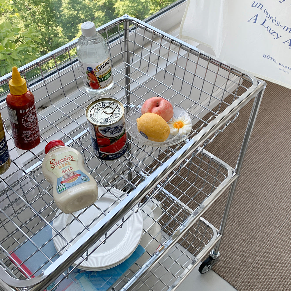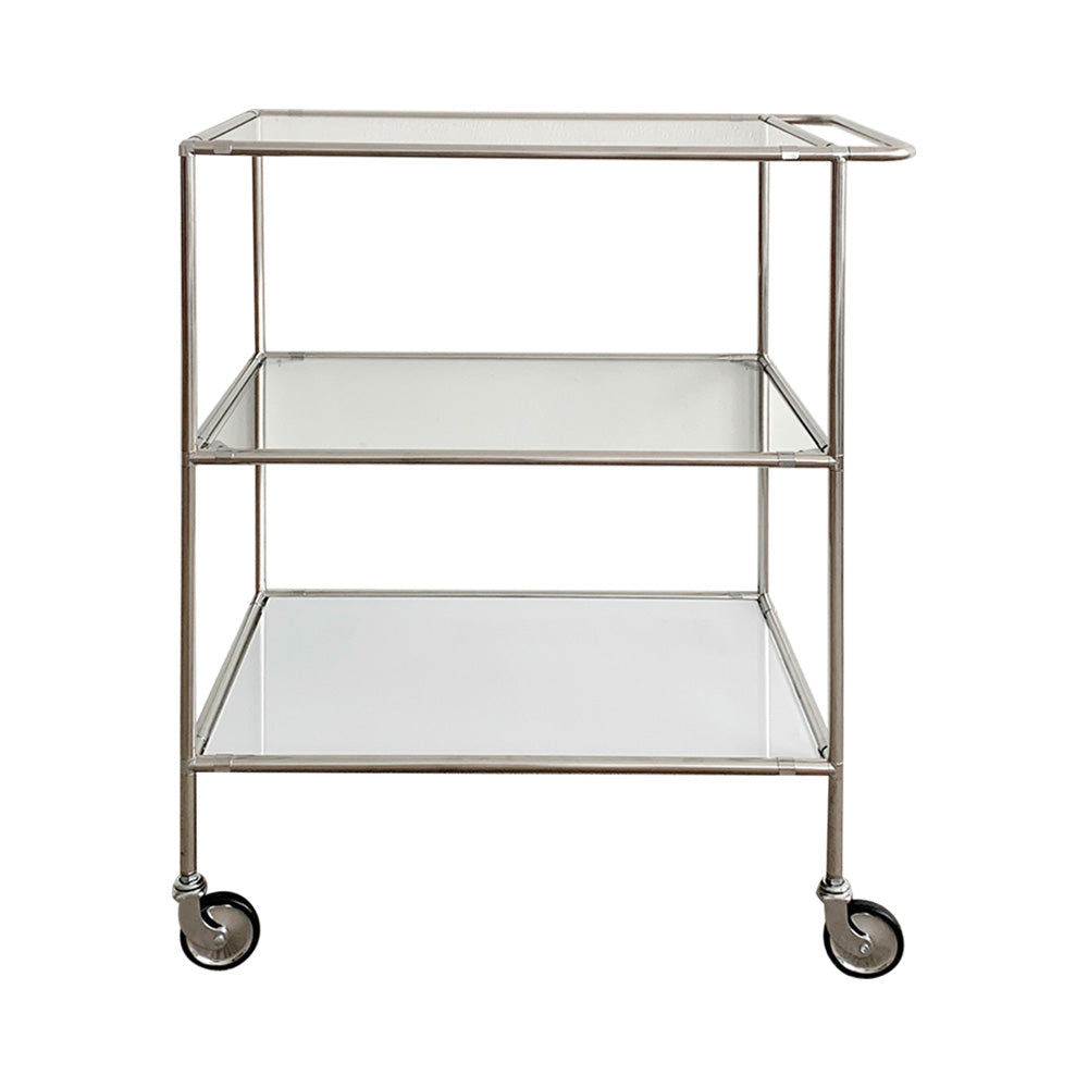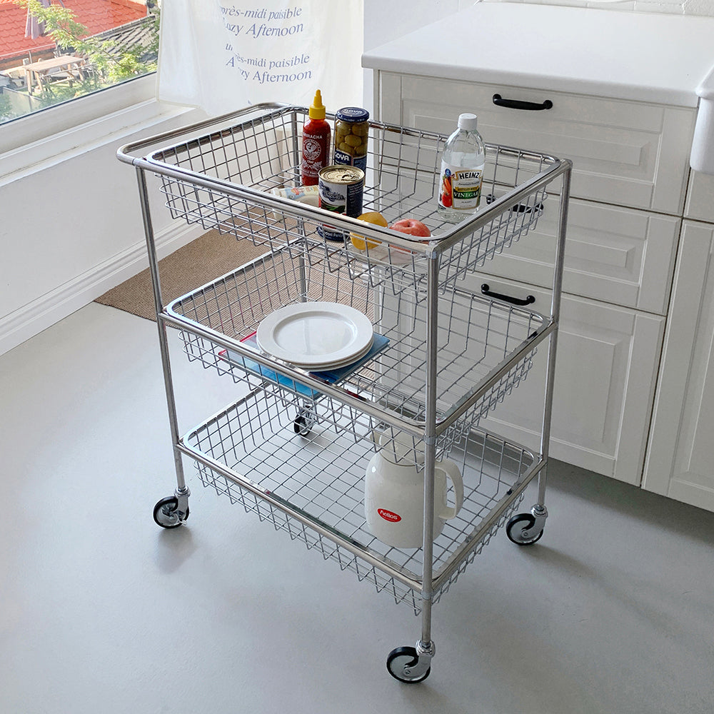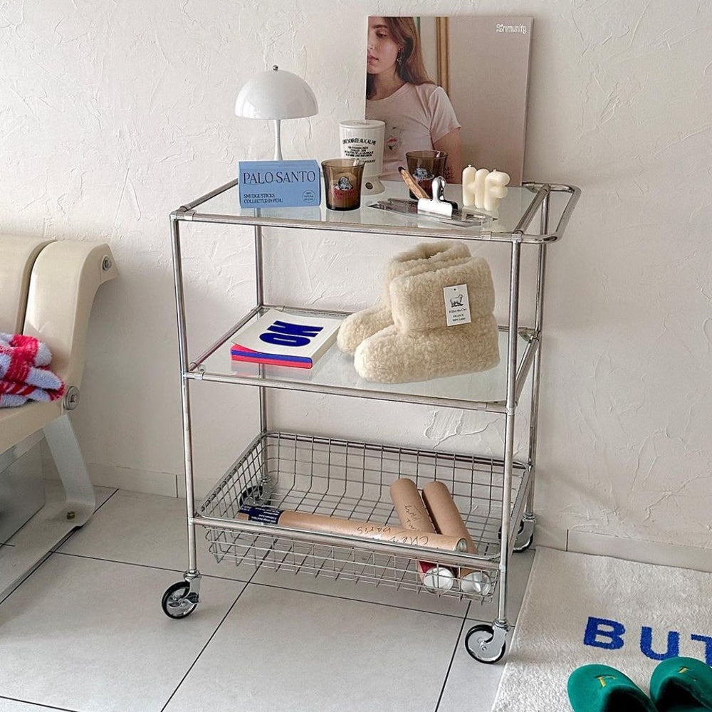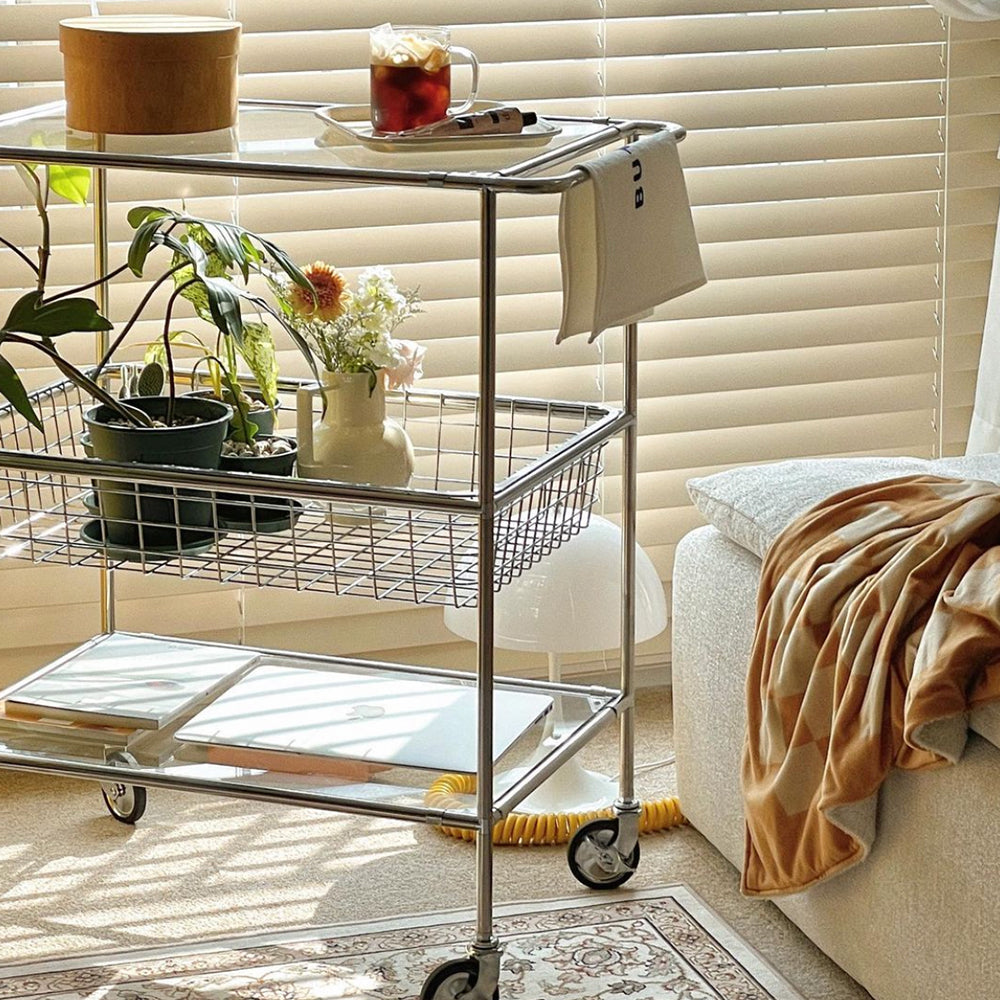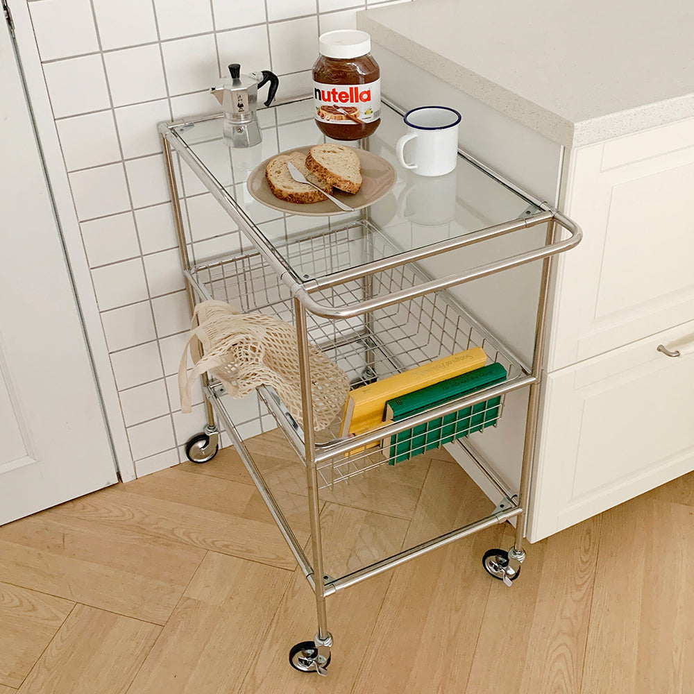 モジュール家具3段トロリーはシンプルでモダンなデザインでバスケットとカラーガラスの中から好みに合わせてカスタムでき、空間の制約なく自由な移動が可能な実用性の高い家具です。