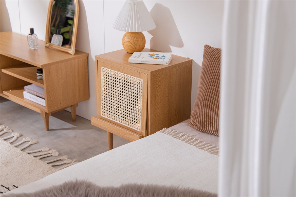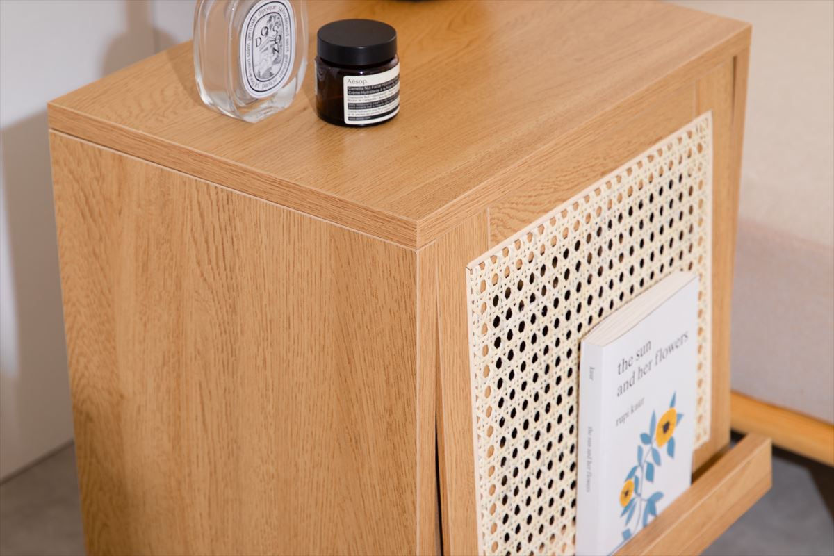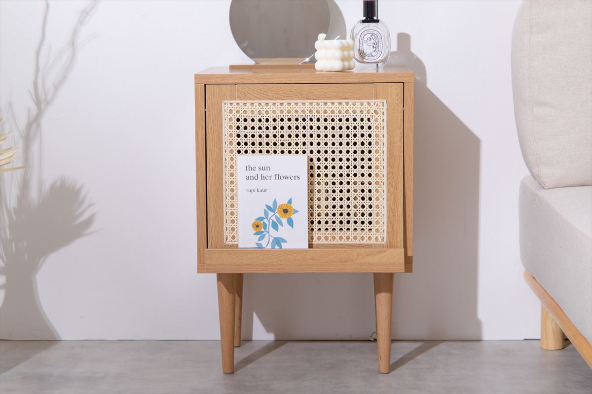 天然ラタンと美しい木目調を使用した、ナチュラルで温かみあるラタンサイドキャビネットです。ラタン部分は抜け感のカゴメ編みが爽やかに上質な雰囲気を演出しています。また、お部屋に取り入れやすいコンパクトサイズながらも、たっぷり収納可能ですっきりした空間を作ることができます。