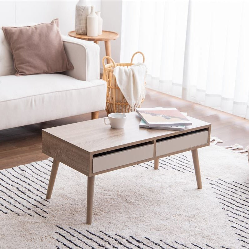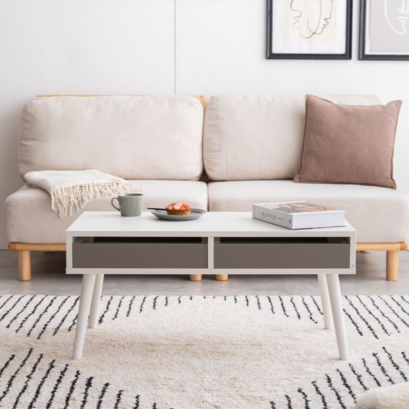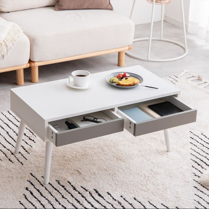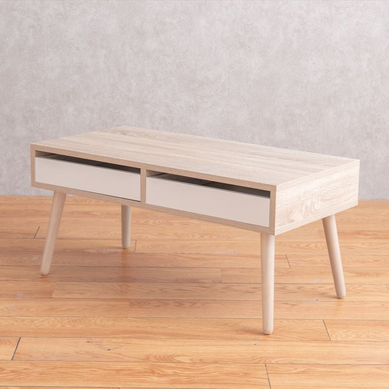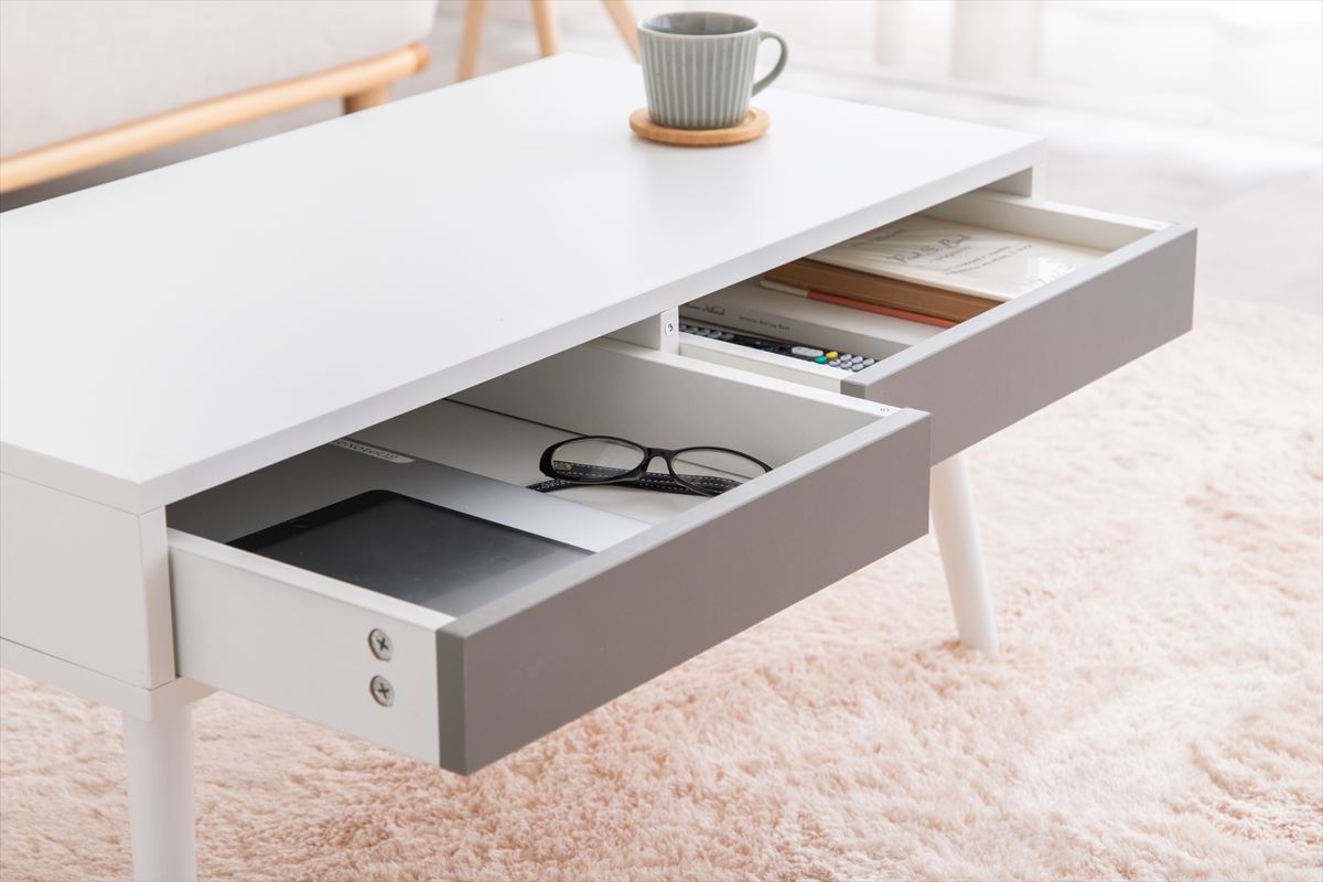 引き出し付きですっきり片付くコンパクトなセンターテーブルです。両サイドから使える2杯の引き出し付きで、ノートPCやリモコンなど使う頻度の高い物をすっきりと収納できます。また、無駄なスペースが無くコンパクトサイズながらも、食事や作業をするのに十分な広さの天板を備えます。