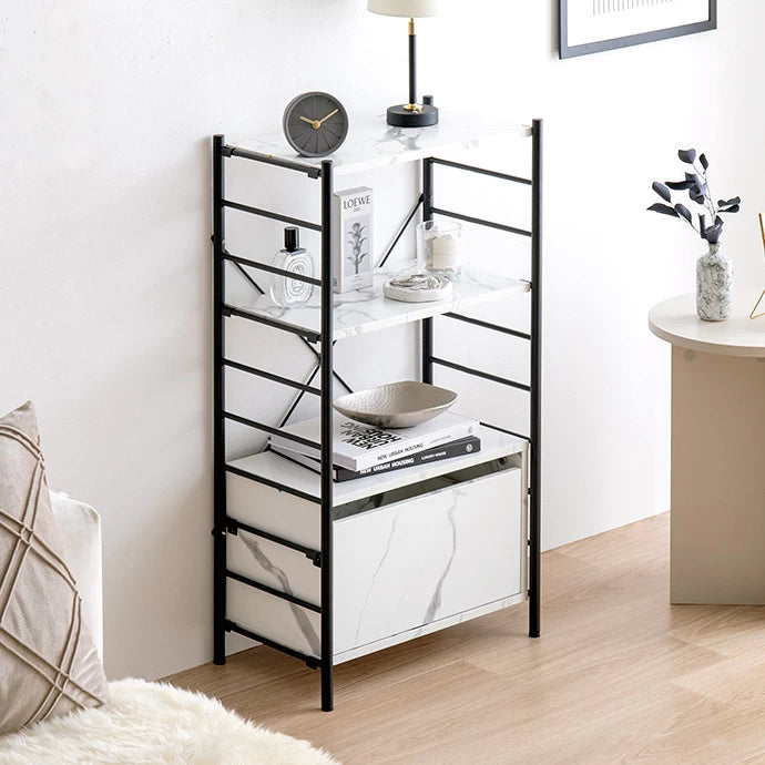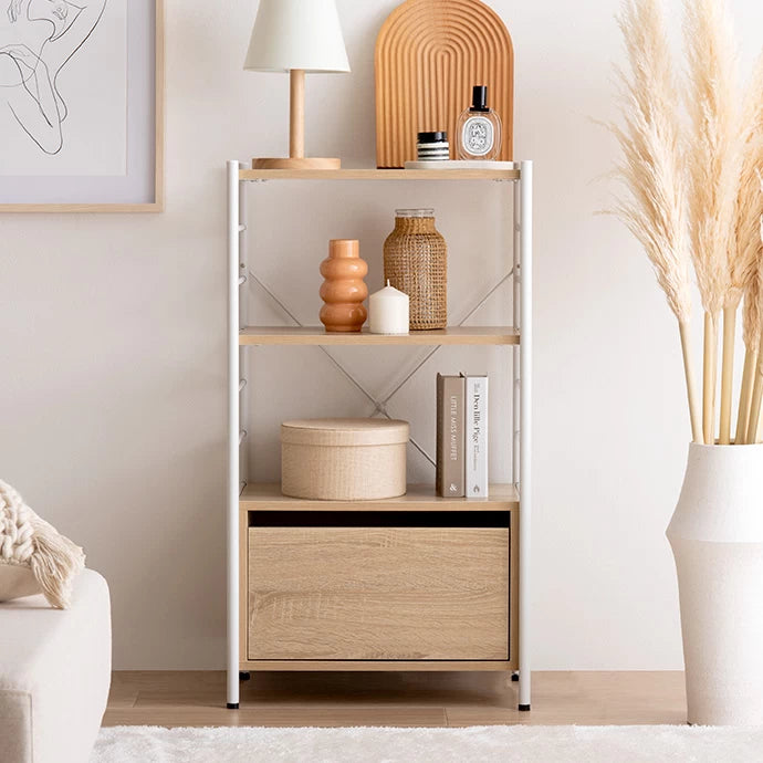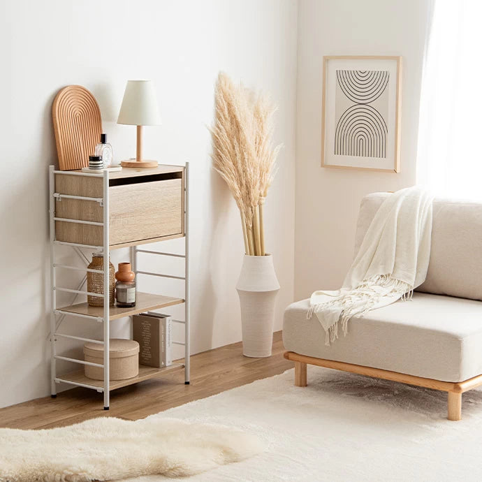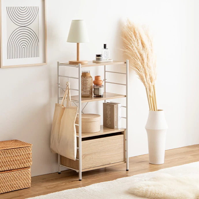 機能的で洗練された空間を作る引き出し付きシェルフです。圧迫感の無い抜け感のあるデザインがお部屋に馴染みやすく、インテリアをおしゃれに引き立てます。スリムでコンパクトですが収納力抜群で、ワンルームにもおすすめです。