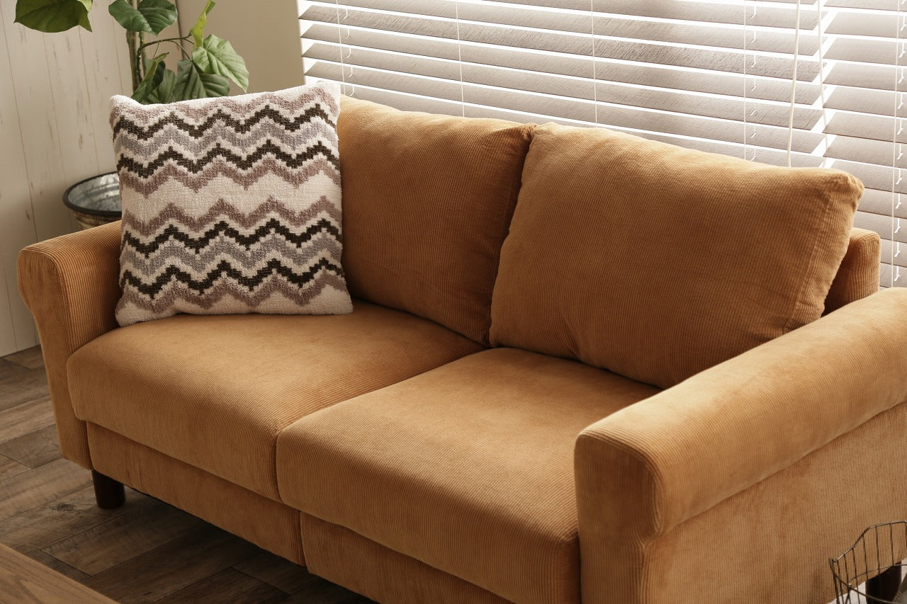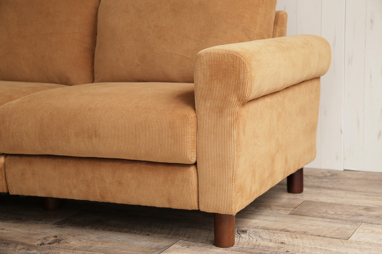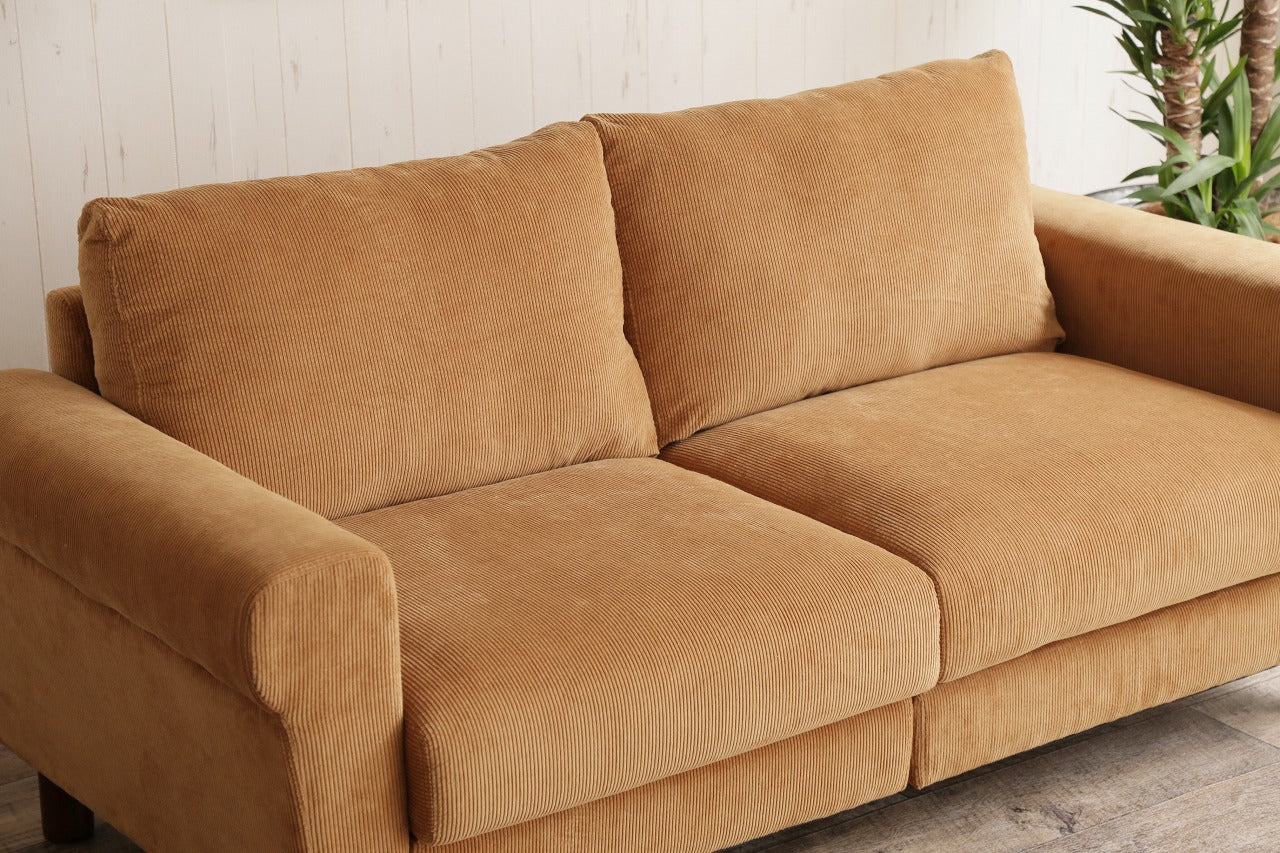 温かみのあるコーデュロイと丸みのある肘掛けが特徴的な2人掛けソファです。ふかふかのクッションで肌触りが良く、お部屋全体を優しい雰囲気にしてくれます。