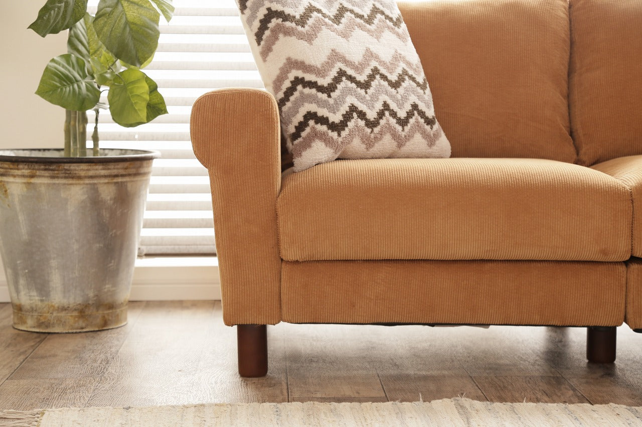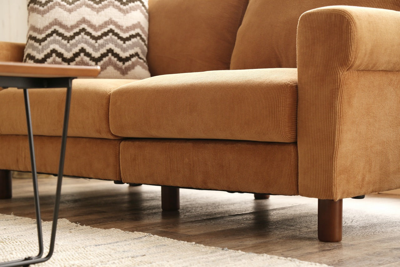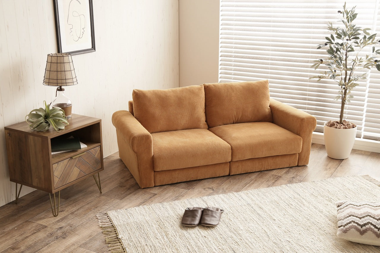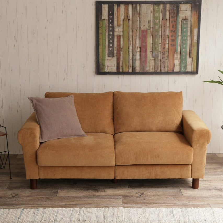 温かみのあるコーデュロイと丸みのある肘掛けが特徴的な2人掛けソファです。ふかふかのクッションで肌触りが良く、お部屋全体を優しい雰囲気にしてくれます。