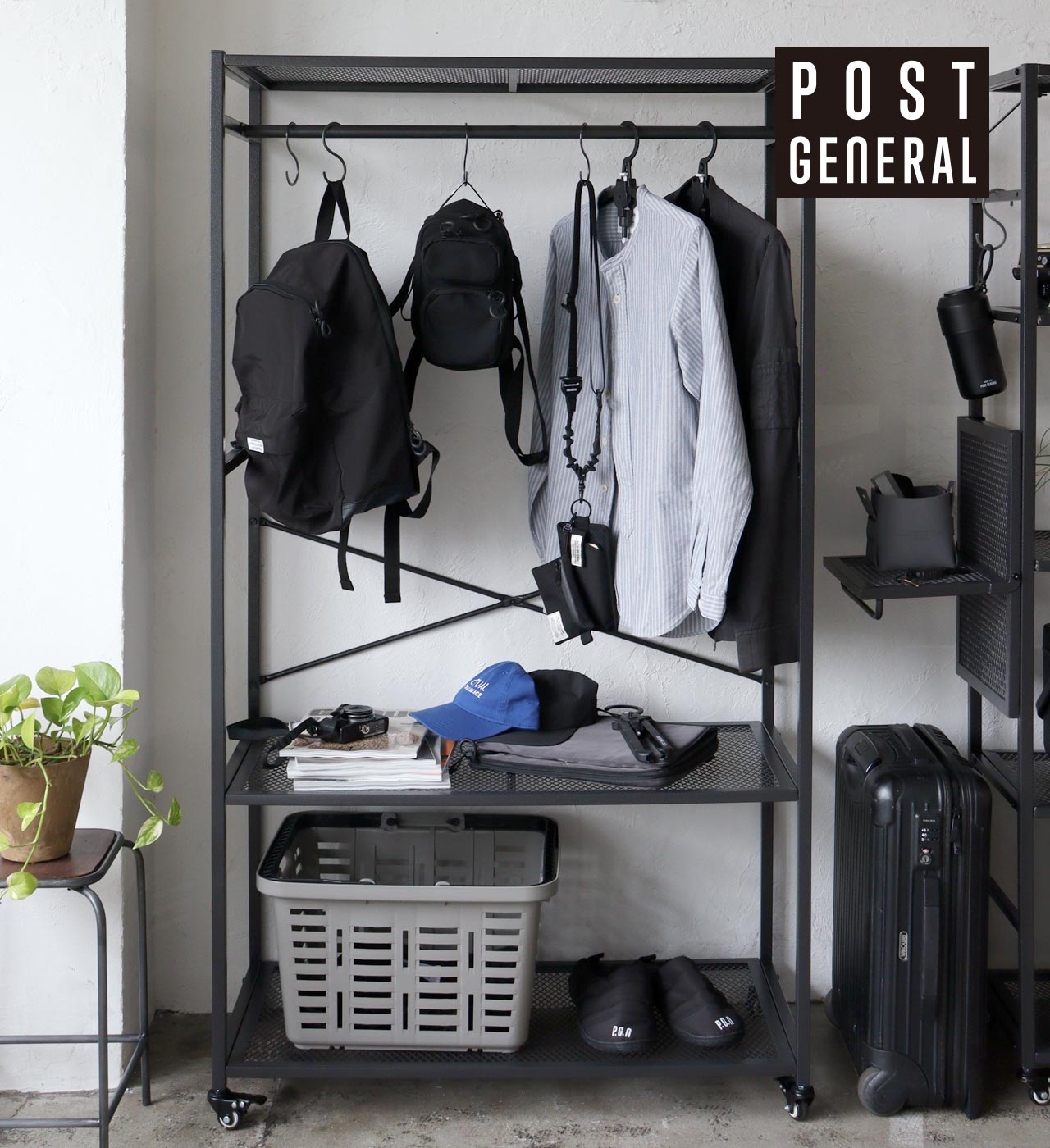 メッシュ状の棚板を採用し、軽量化を図ったスチールシェルフシリーズのコートハンガーラックです。中段の棚板を取り外すとロングコートなどの丈の長いものを収納することができるので、アイテムに合わせて収納をカスタマイズすることが可能です。さらに、ラックの下段にPOST GENERALの「ヘビーデューティーバスケット(※別売)」を組み合わせると、日用品や雑貨の収納にスペースの無駄なくシェルフを活用いただけます。
