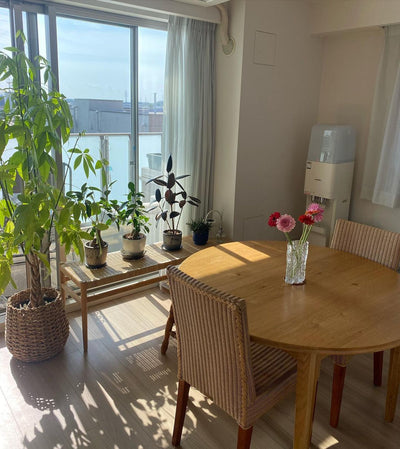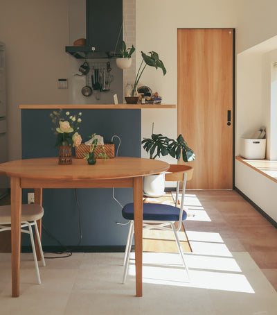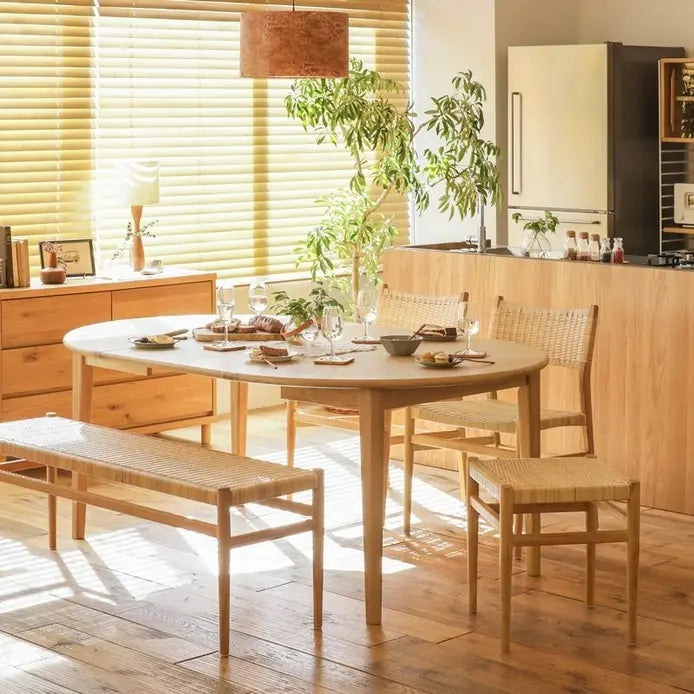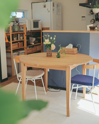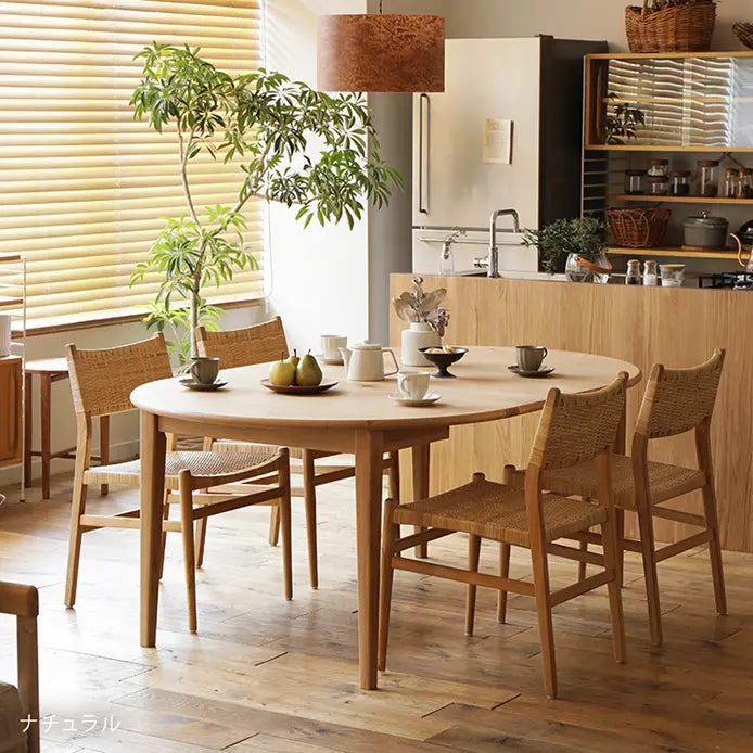 人の増減にフレキシブルに対応する伸長式のダイニングテーブルです。楕円形にしたことで、長方形よりも多くの人が座れます。角に丸みを持たせた天板は、小さなお子様がいる家庭でも安心してお使い頂けます。