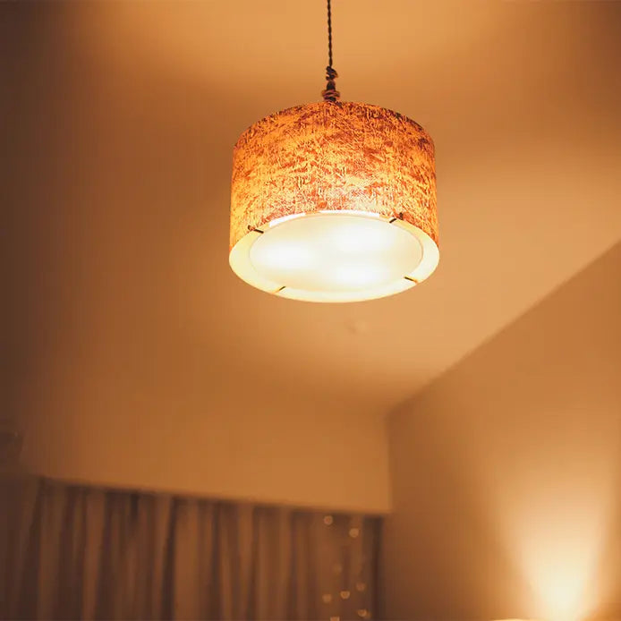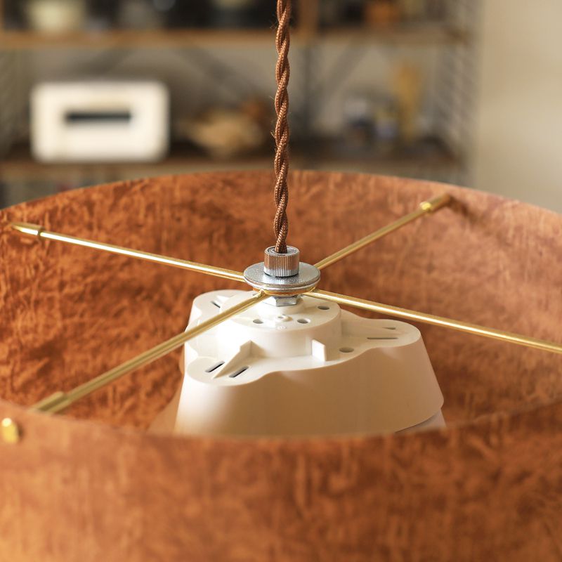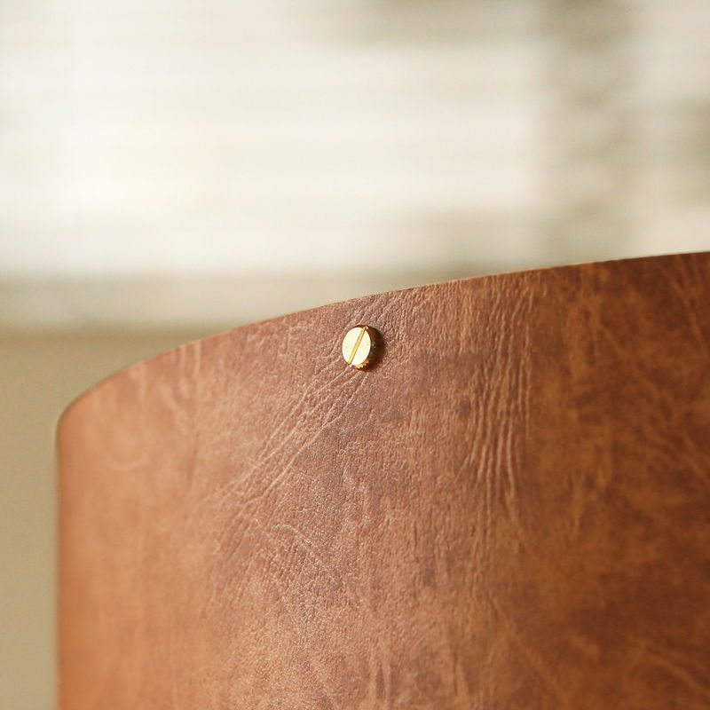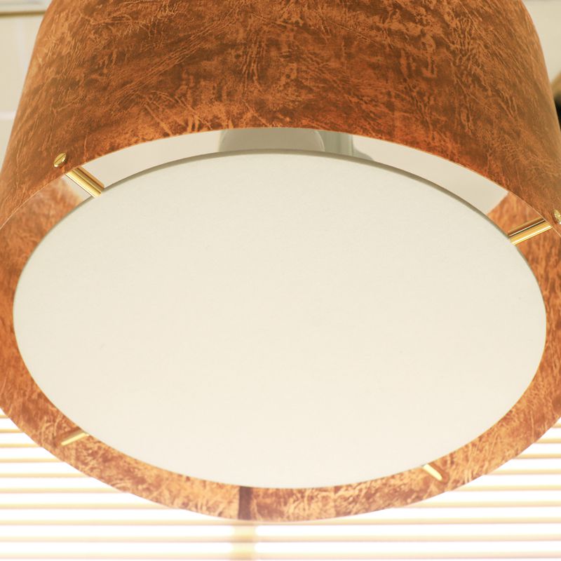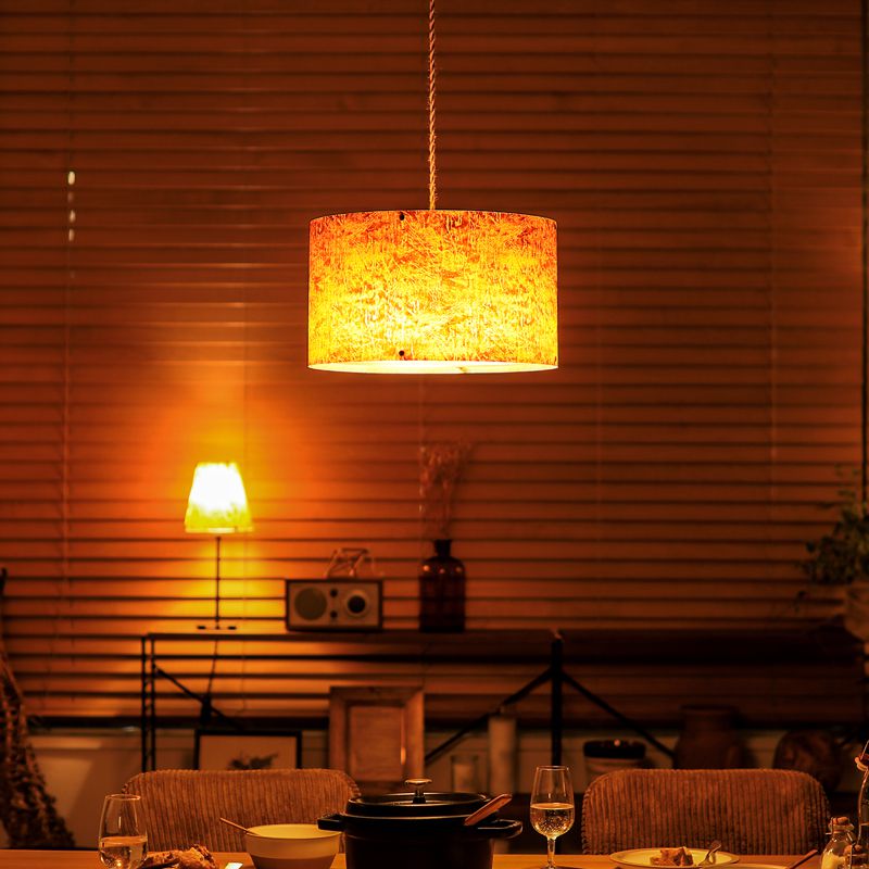 独特の意匠と質感を持ったシェードが特徴のペンダントライトです。まるで本物のレザーのような質感を再現されています。この素材感は、照明の温かみと相まって、空間全体に落ち着いた雰囲気を与えます。