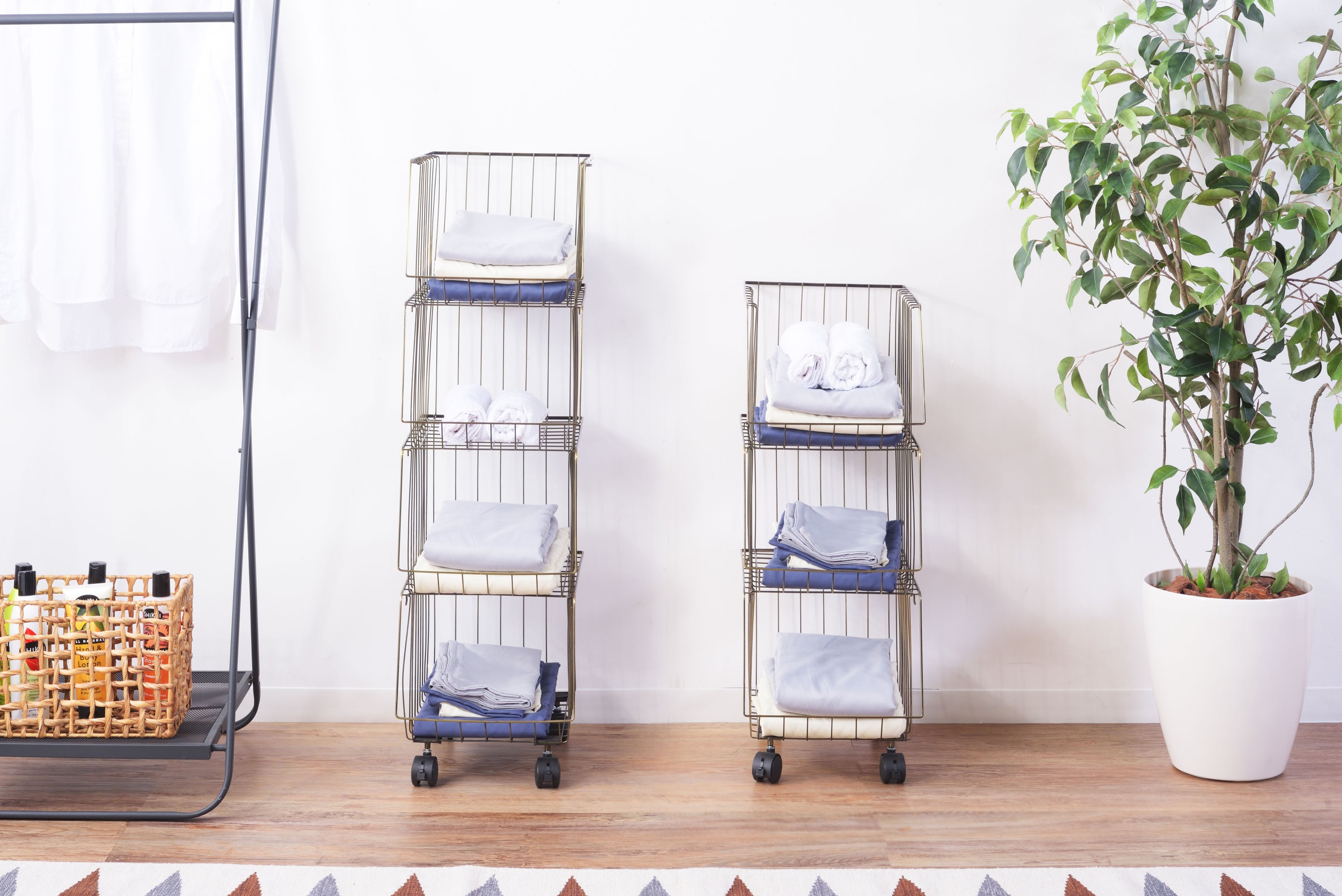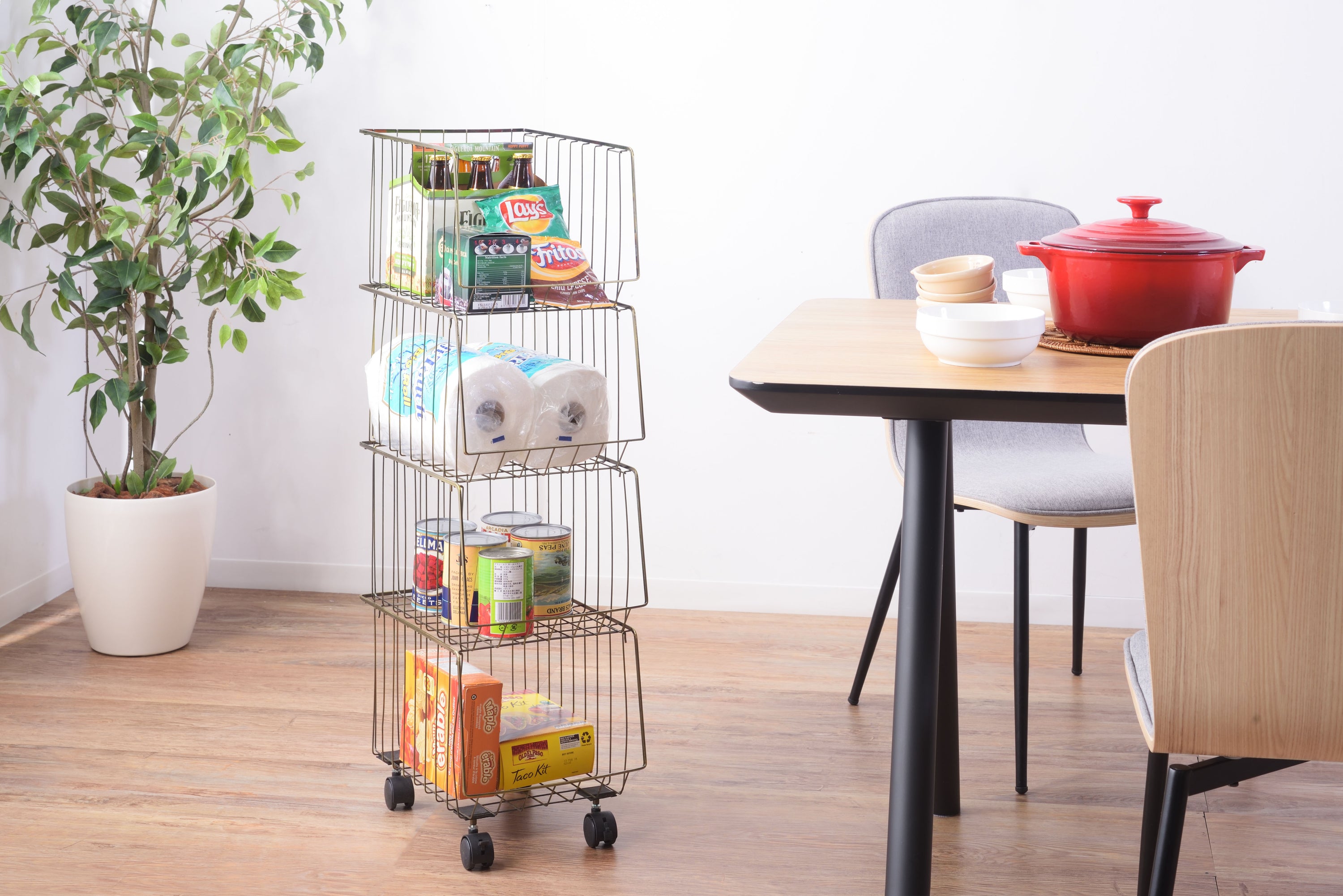 シンプルで使い勝手が良いスタッキングワゴン 机の横に置いて書類や雑誌を入れたり、洗面所のタオル入れなど様々なシーンで大活躍です。 キャスターも付いていますので移動もラクに行なえます。 スタッキングができるので使わないときは重ねてコンパクトに収納ができます。